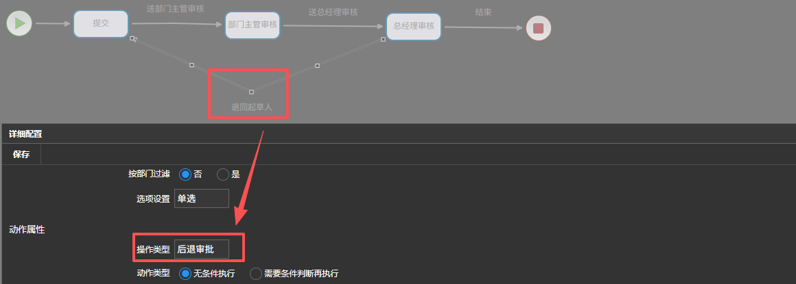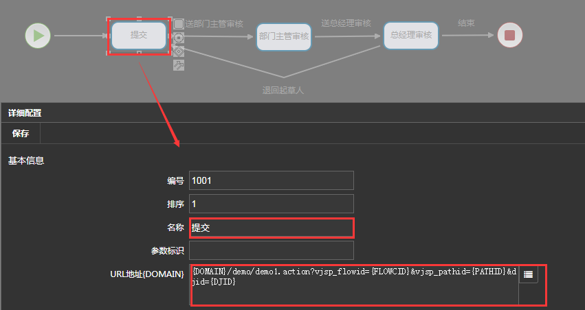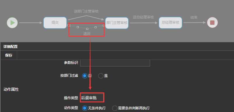 新建流程后,窗体设置绑定流程,进入流程设置页面,点击流程控件拖拽到页面形成流程,右击人工控件,点击【详细配置】,在详细配置页面,设置URL地址和名称,在“部门主管审核”与“提交”节点设置连线,箭头方向由“部门主管审核”指向“提交”,并且连线的操作类型为后退审批,如下图: