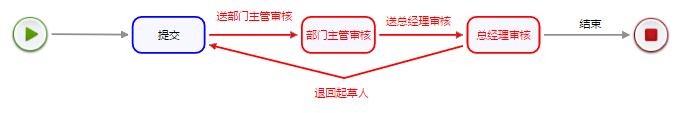 案例2:“总经理审核”的时候发现问题,将窗体直接退回给起草人,退回跨越几个活动,如下图:
