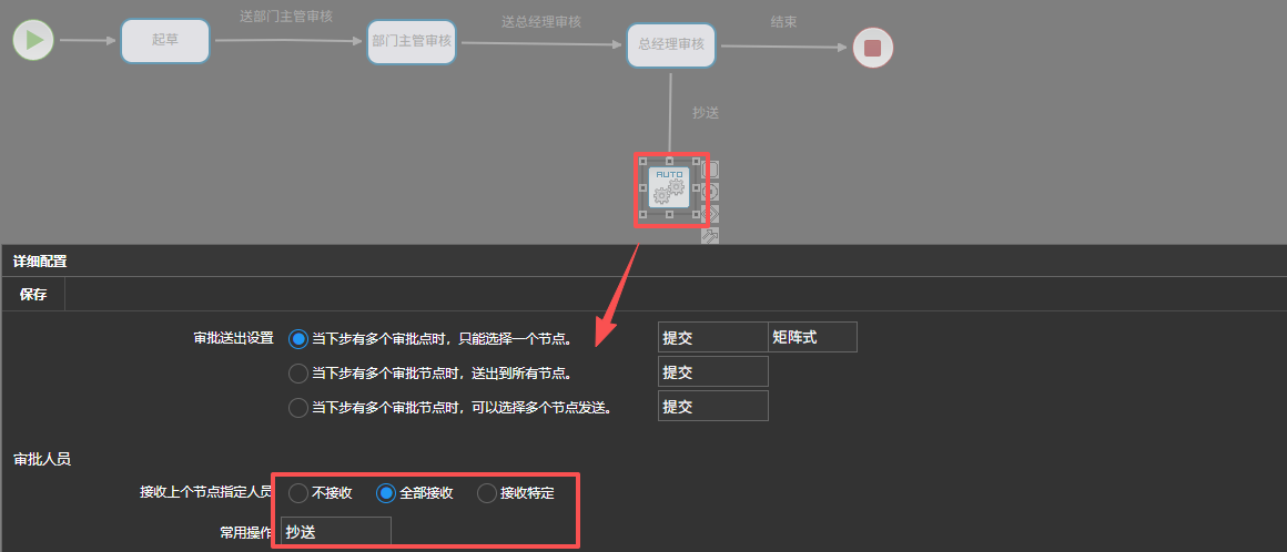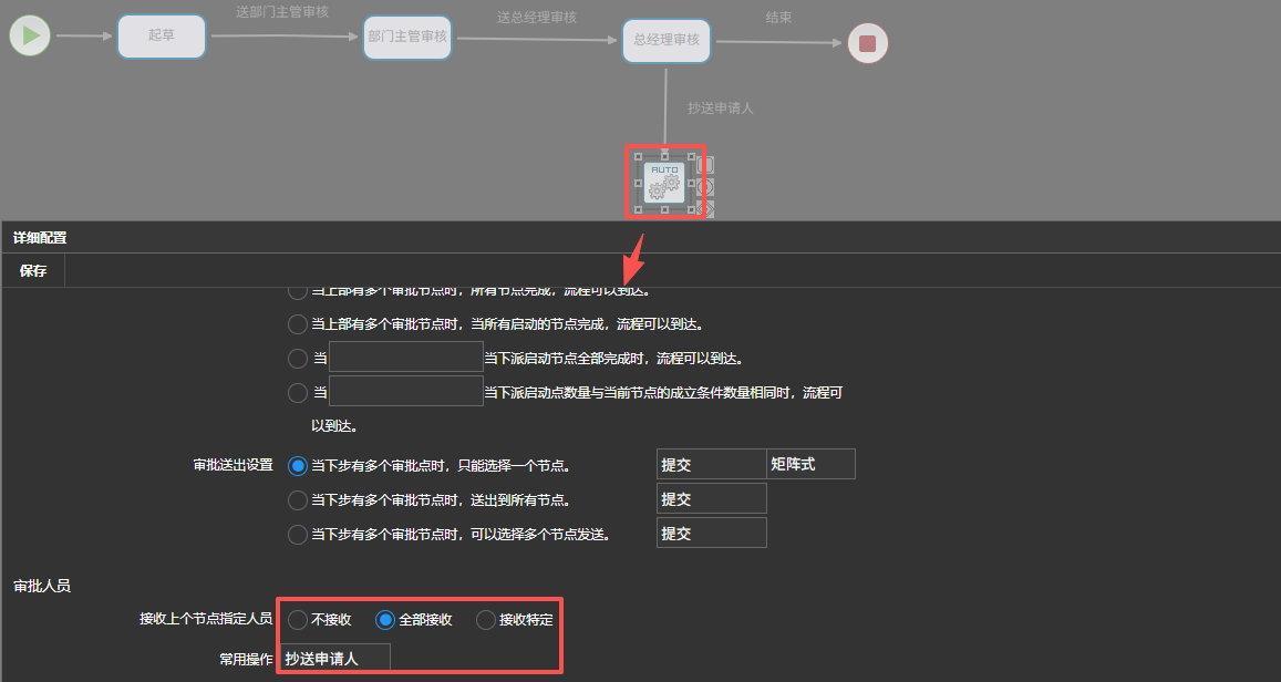 设置自动控件常用操作为【抄送】,允许接收上个节点批定人员,如下图: