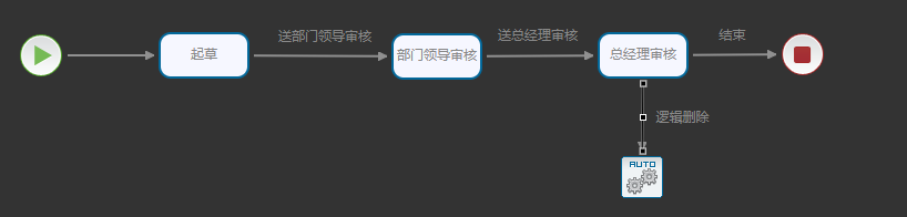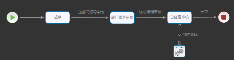 在“总经理审核”节点添加自动控件和连线控件,并修改连线名称和设置自动控件的常用操作为物理删除,如下图: