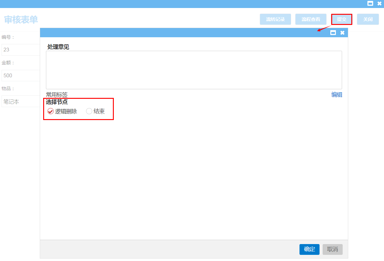逻辑删除模式是将当前窗体作废删除,终止审批