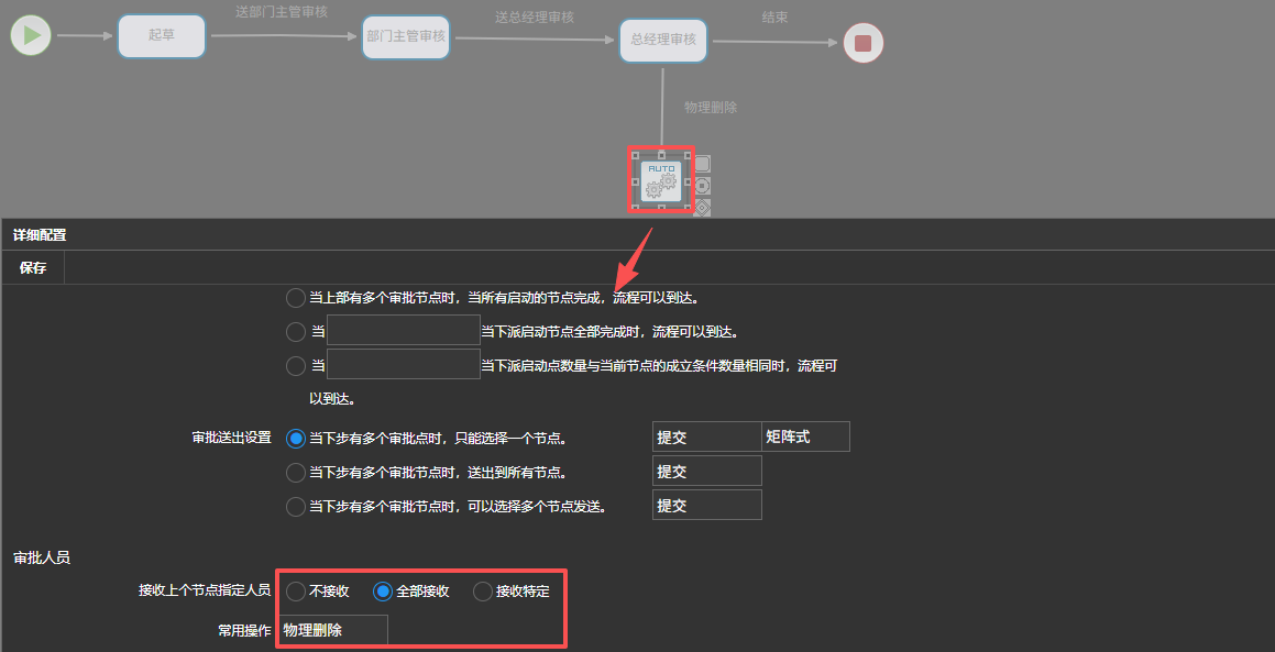 在“总经理审核”节点添加自动控件和连线控件,并修改连线名称和设置自动控件的常用操作为逻辑删除,并且允许接收上个节点批定人员,如下图: