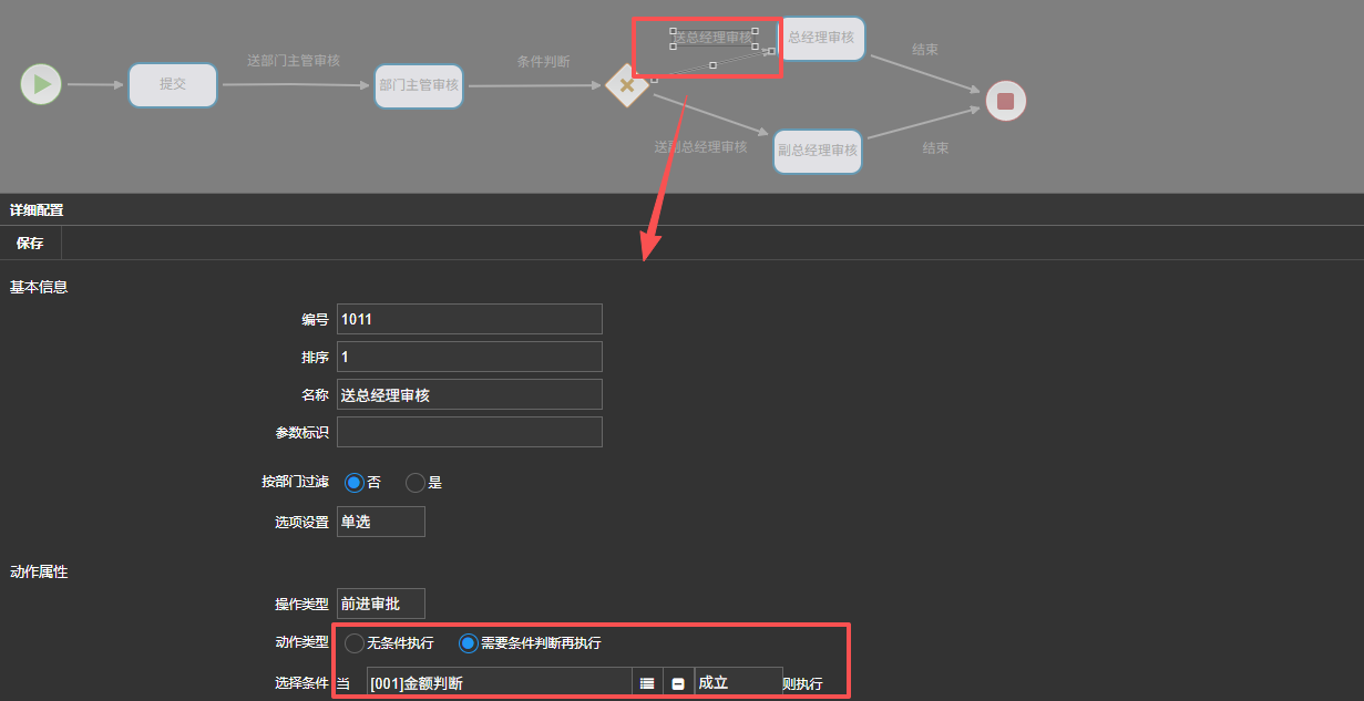 在“送总经理审批”连线控件中设置判断条件成立,如下图: