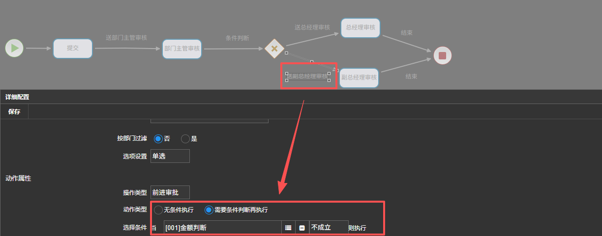 在“送副总经理审批”连线控件中设置判断条件不成立,如下图: