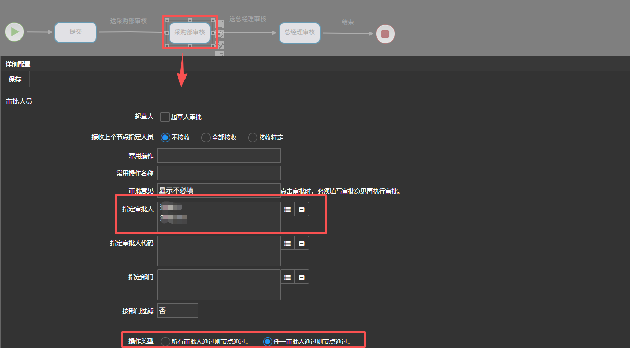 设置【采购部审核】节点的审核人员,并且【操作类型】选择:任一审批人通过,则节点通过,如下图: