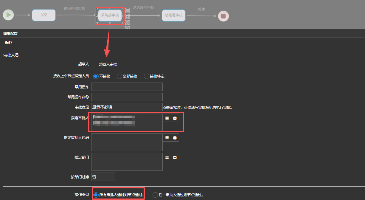 设置【采购部审核】节点审核人员,并且【操作类型】选择:所有审批人通过,则节点通过,如下图: