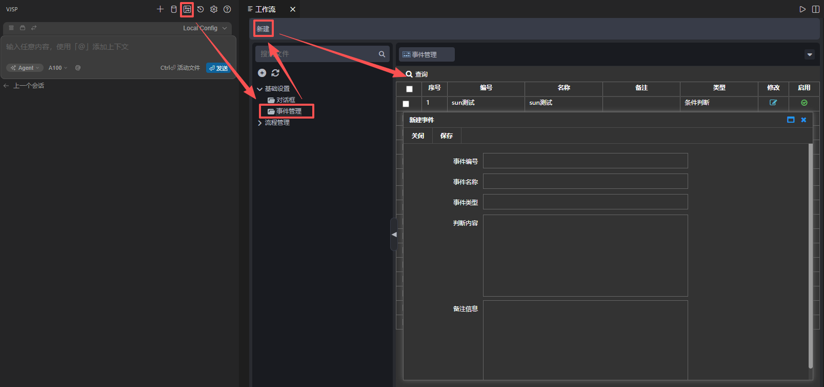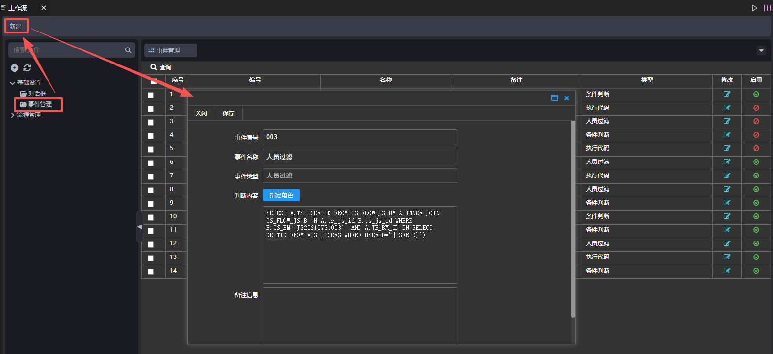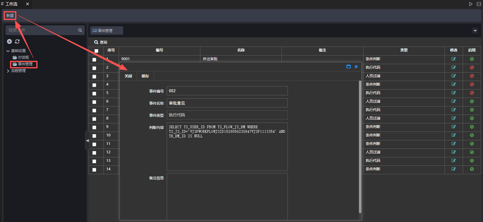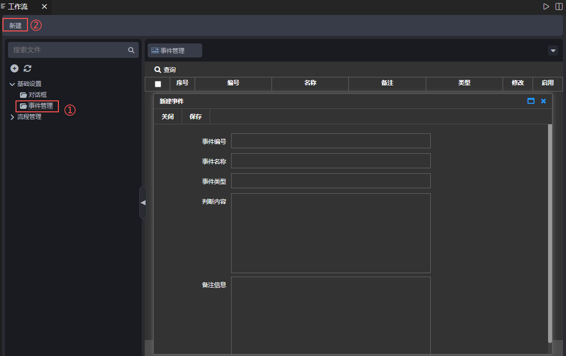 操作如下:点击【工作流设计器】→【基础设置】→【事件管理】→【新建】,弹出新建页面,输入事件编号、事件名称、事件类型、内容、备注信息,点击【保存】,如下图: