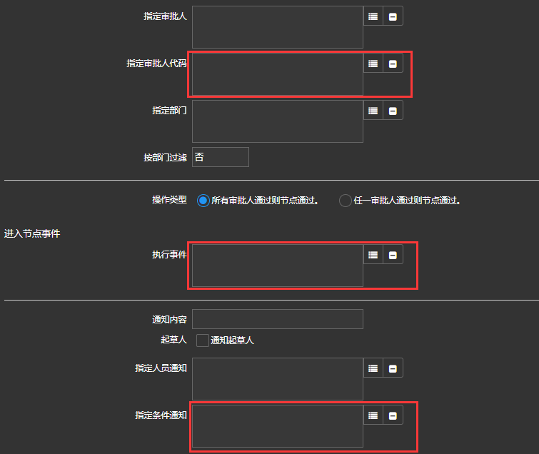 应用于流程线或流程节点的节点进入事件和节点通过事件以及节点特定范围内的人员审批设置项。