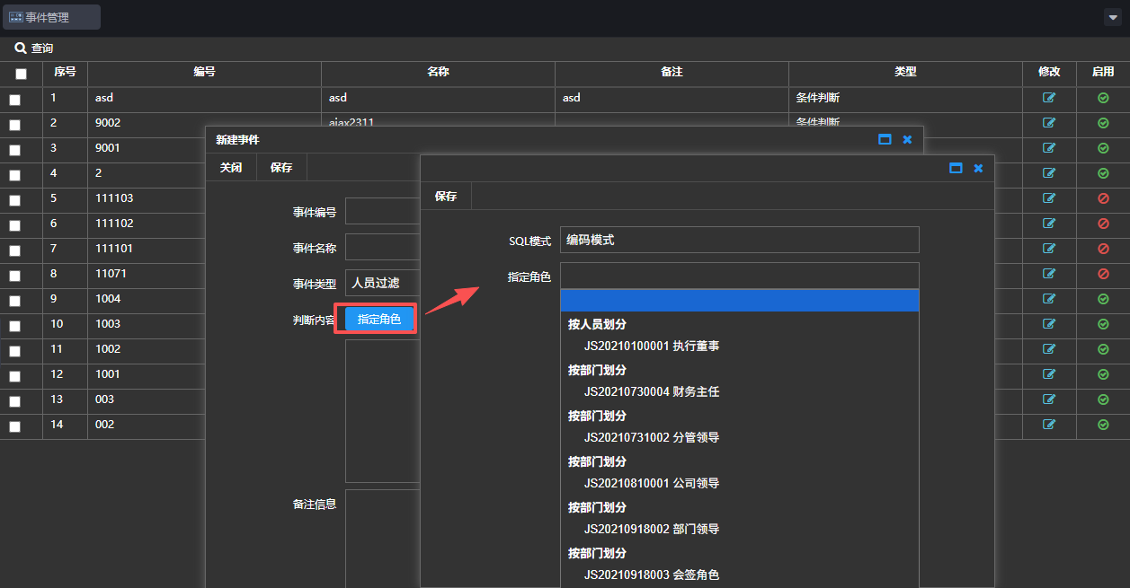 新建事件管理,设置人员过滤条件,选择符合条件的人员为该节点审批人,事件类型为:“人员过滤”,如下图: