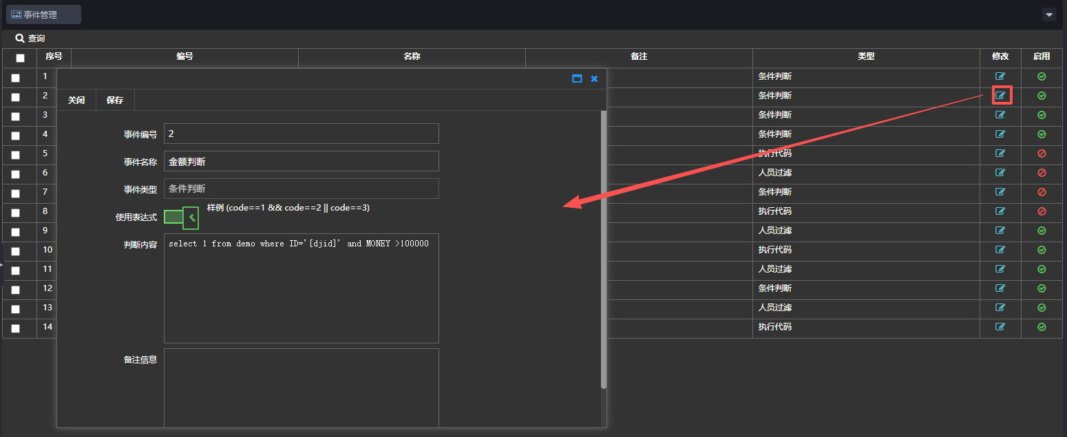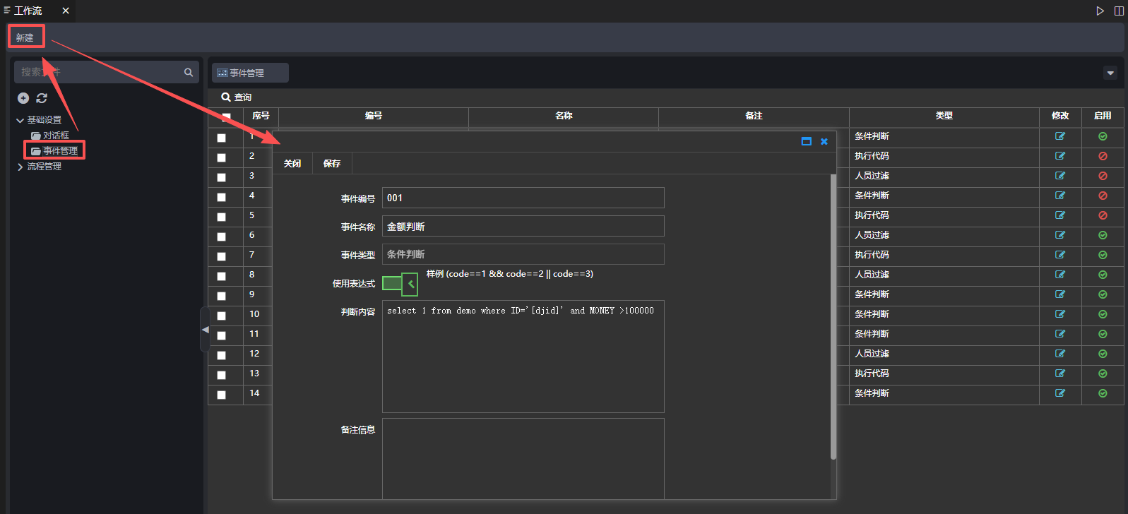 新建金额判断事件,点击【事件管理】,弹出页面点击【新建】,弹出页面输入事件编号、事件名称、SQL语句,选择事件类型,如下图: