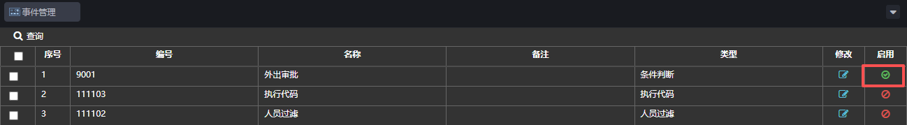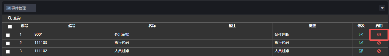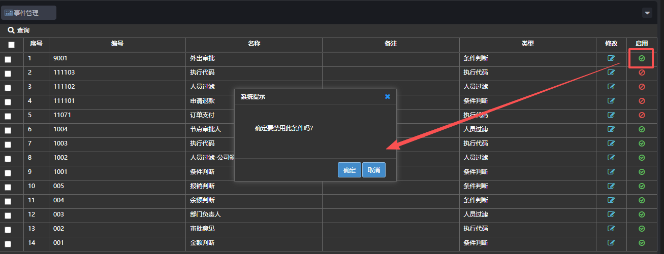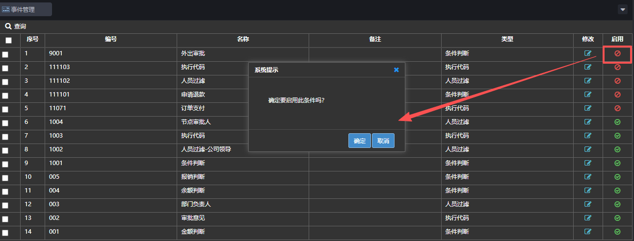 启用操作如下:在事件管理页面,事件在禁用状态下,点击启用/禁用按钮,弹出对话框点击【确定】,事件被启用,如下图: