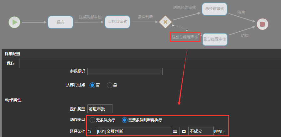 设置副总经理审批条件(金额<10000) 点击流程中的连线控件,设置如下图: