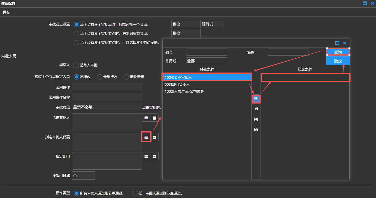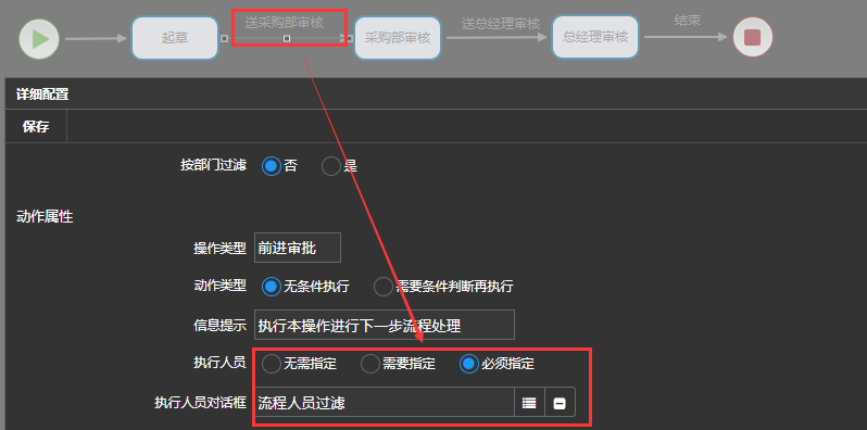 设置“采购部审核”节点的指定审批人代码,如下图: