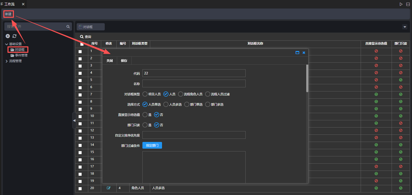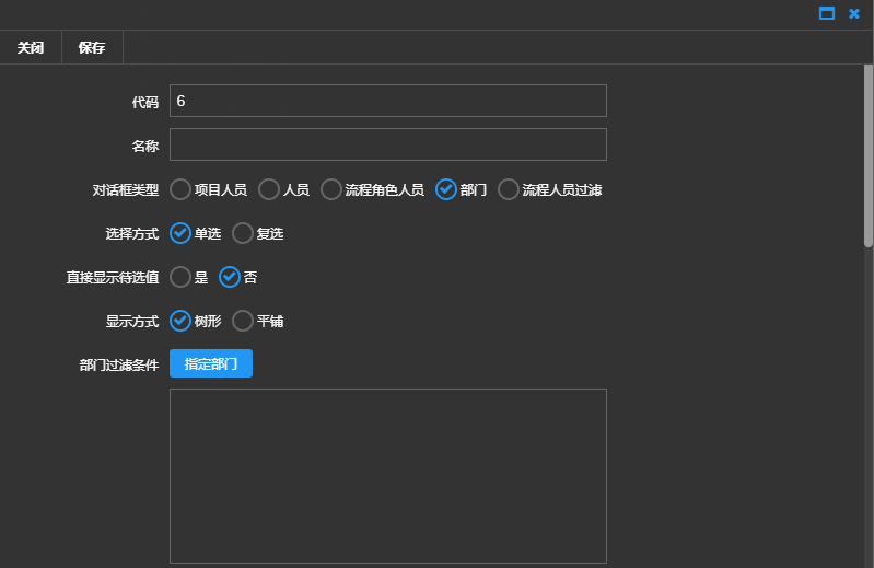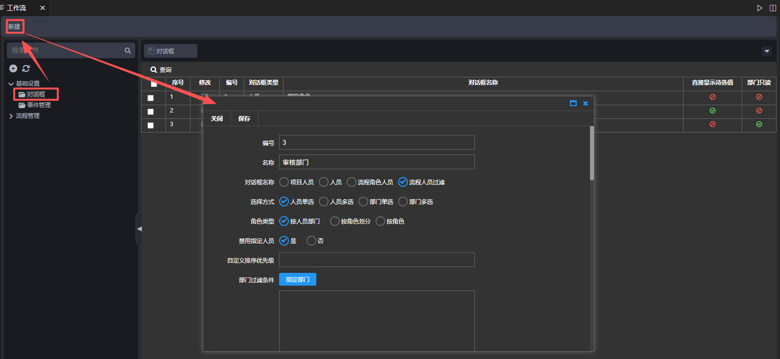 1)新建对话框管理,在对话框管理页面点击【新建】,弹出新建页面,对话框类型选择流程人员过滤,角色类型选择按部门划分,设置部门过滤条件,点击【保存】,如下图: