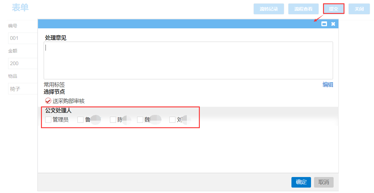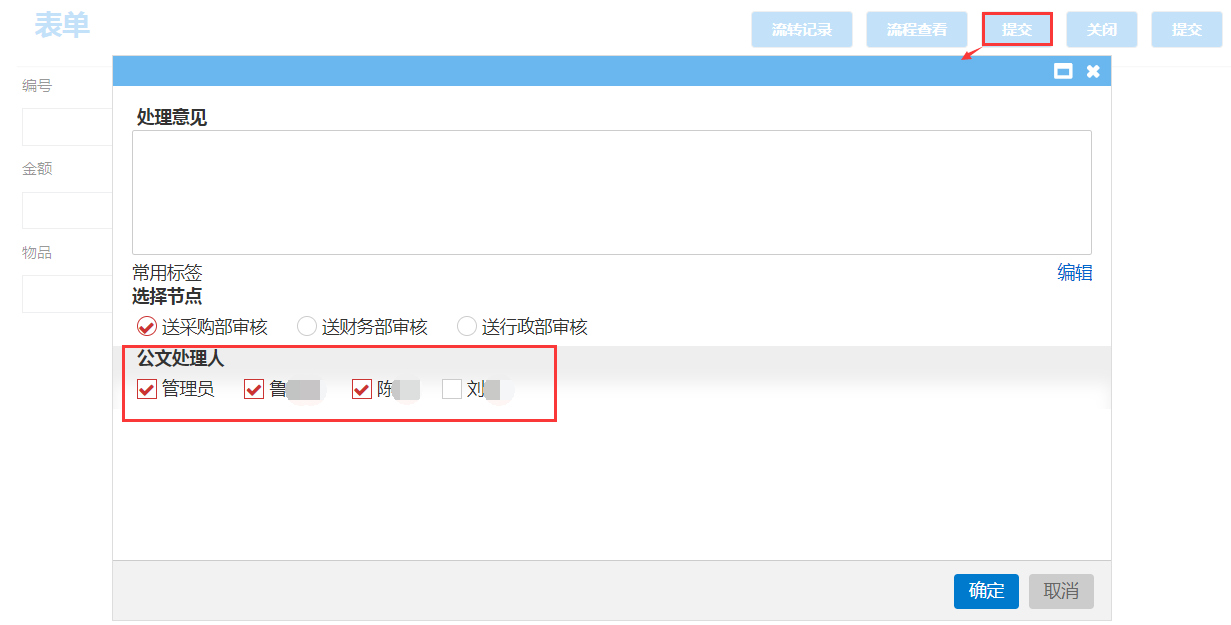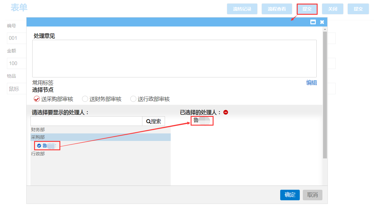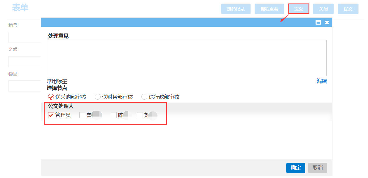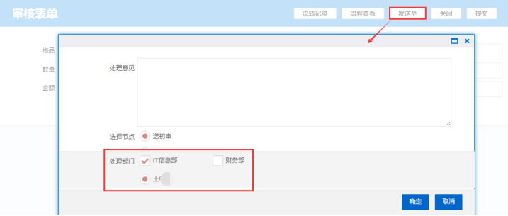 效果如下图:登录应用平台,起草窗体提交财务审核时输入处理意见为“财务部门通过审核!”,在提交总经理审核节点时,点击【提交】,弹出页面【处理意见】自动显示为“财务部门通过审核!”,如下图: