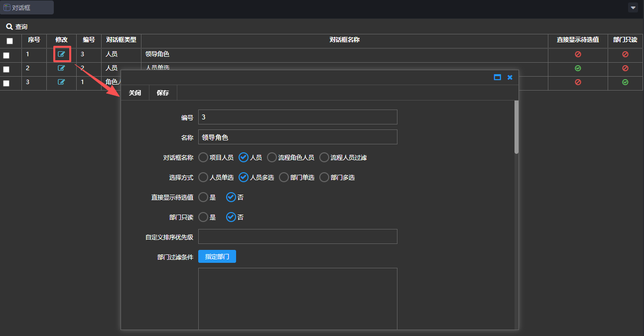 操作如下 :在对话框管理页面,点击修改按钮,弹出修改页面,修改相关属性,点击【保存】,如下图: