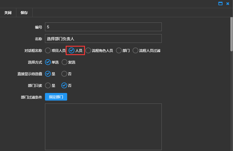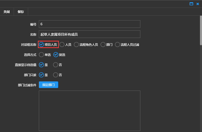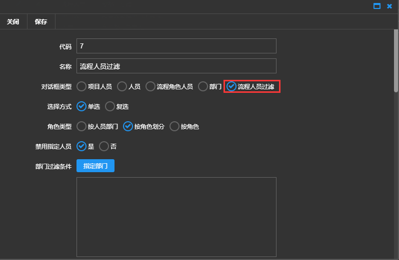 角色类型(只有对话框类型选择流程人员过滤时才有):可以选择按人员部门、按角色部门、按角色