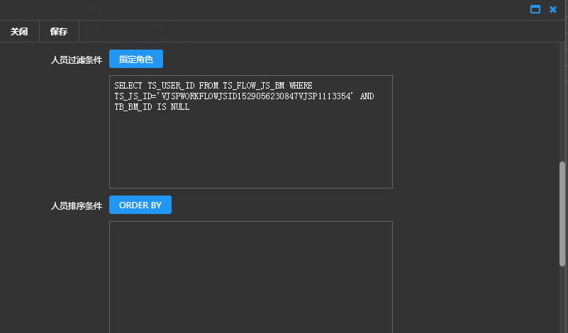 角色排序条件(只有对话框类型选择流程人员过滤时才有): 通过编辑SQL语句中的ORDER BY语句,实现数据按照人员角色字段进行排序
