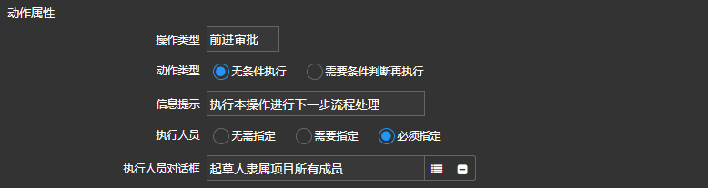 2)在对应窗体流程里连线控件配置里,动作属性里执行人员对话框选择【审核部门】,如下图: