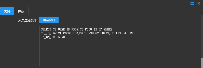 部门过滤条件:可以直接输入SQL语句或者点击【指定部门】选择部门后自动生成SQL语句,来实现通过选择部门中人员审核窗体