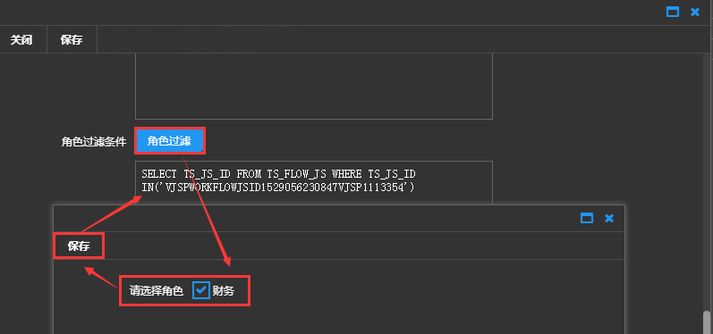 角色过滤条件(只有对话框类型选择流程人员过滤时才有):可以直接输入SQL语句或者点击【角色过滤】选择角色后自动生成SQL语句,来实现审核窗体时选择的角色人员。【注】:角色设置在【流程角色管理】中设置。