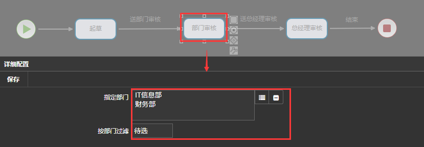 应用案例 :在流程中,部门审核节点审核人员按照部门审核,流程如下图: