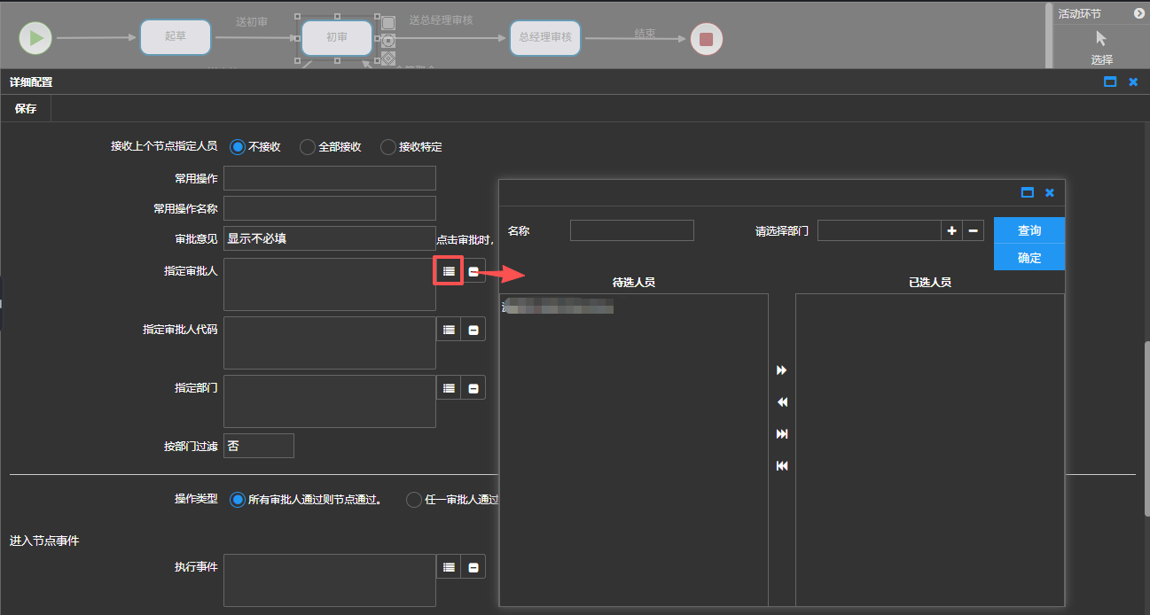 选择【否】,则节点的审核人员需要选择,如下图: