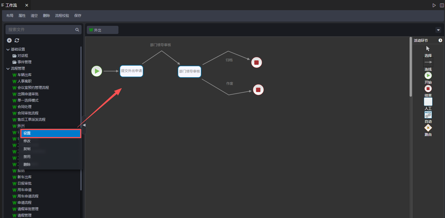 进入流程设置页面操作如下:选择流程,右键选择【设置】,进入流程设置页面,如下图:
