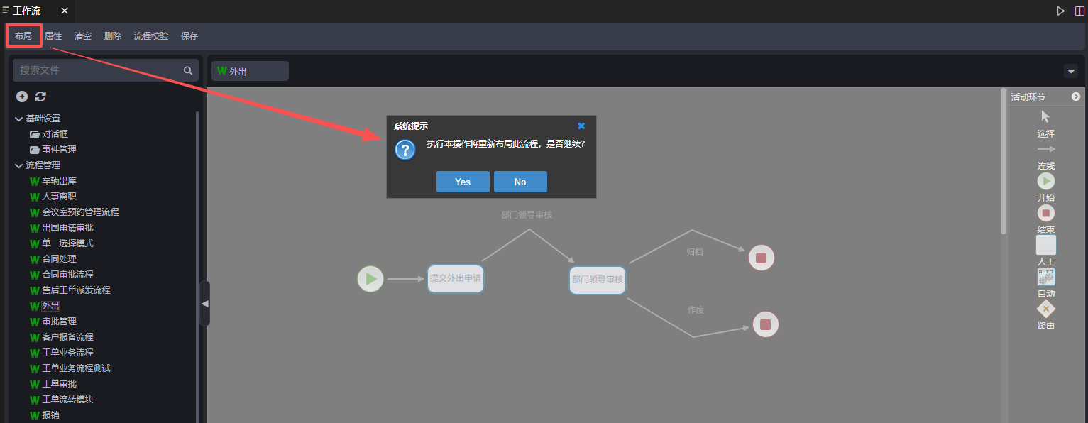 操作如下:点击【布局】,弹出对话框点击【YES】,流程将被重新布局,如下图: