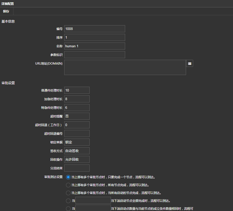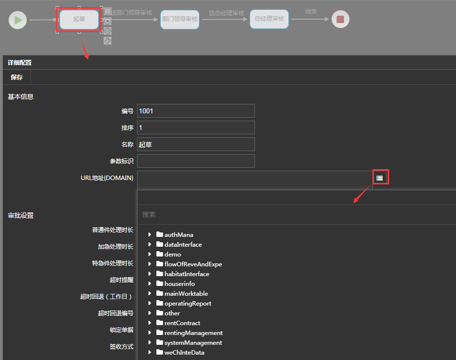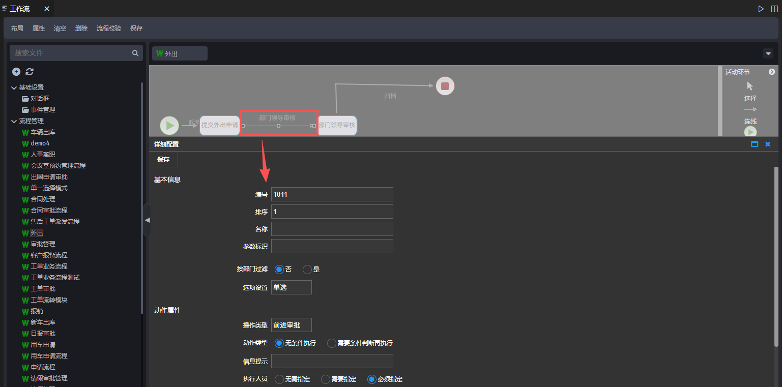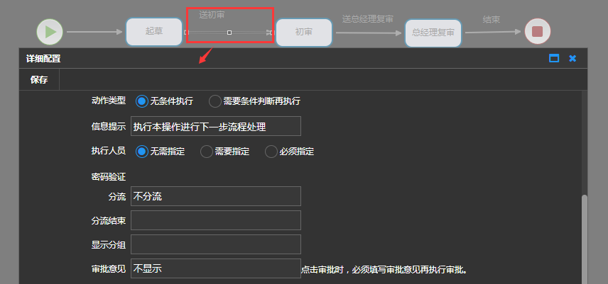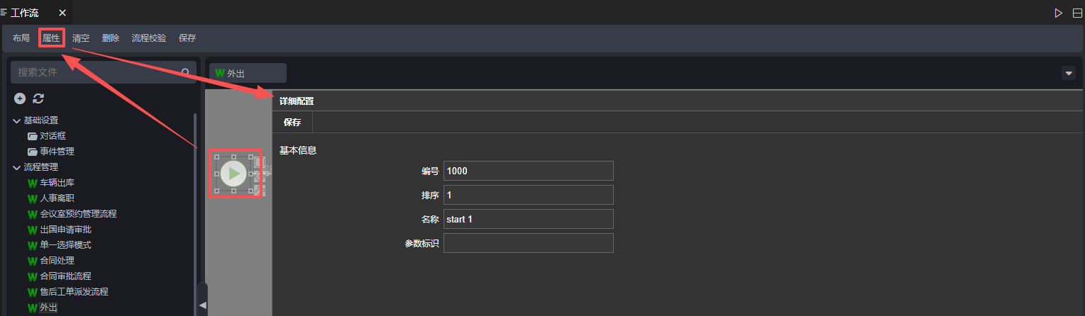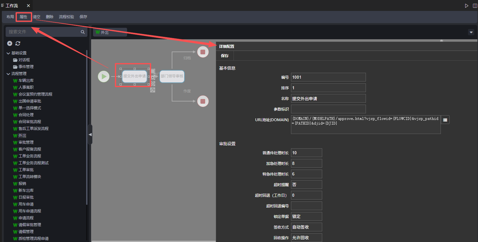 属性: 选中流程控件再点击【属性】,查看控件属性详细配置页面,如下图: