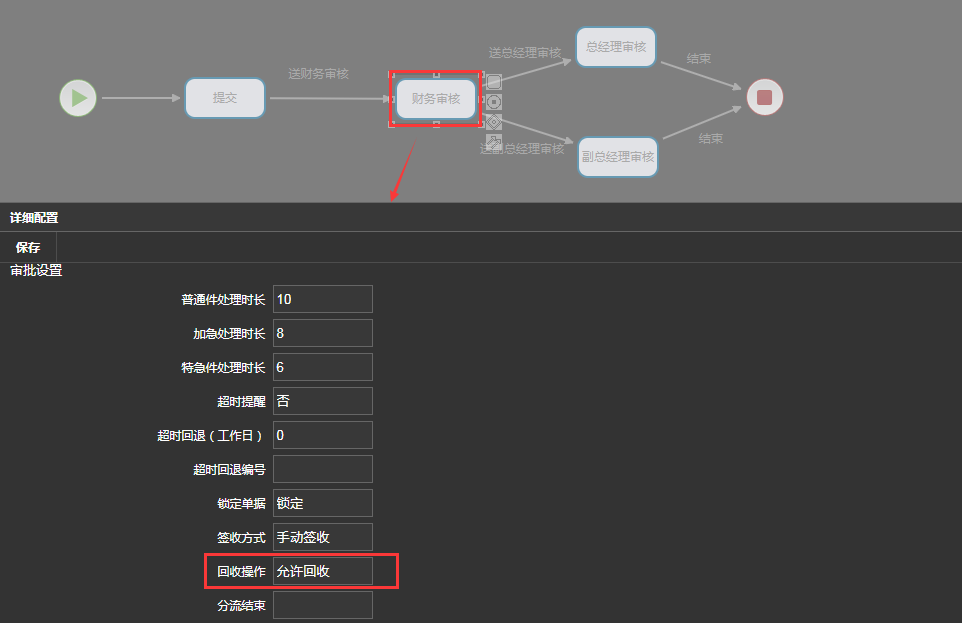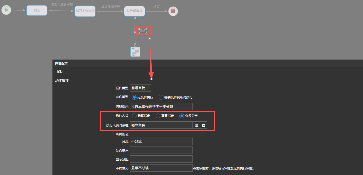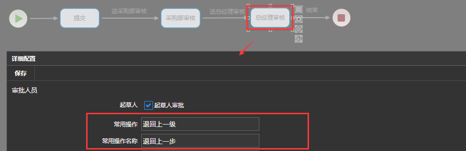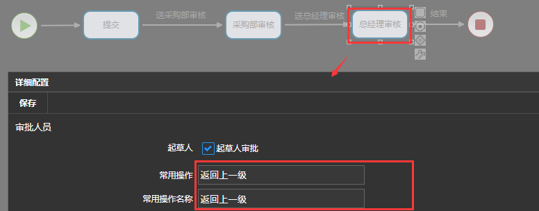 - 在“总经理审核”添加自动控件,并设置自动控件的常用操作为退回上一级,如下图: