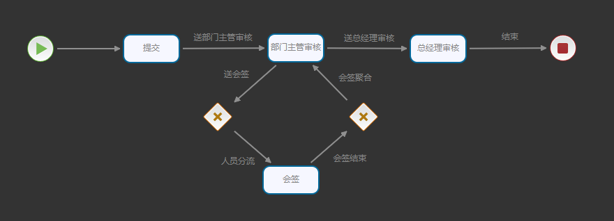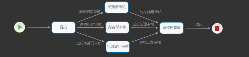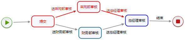 例如 :流程节点“采购部审核”设置审批人王经理、财务部经理,只有两人审核通过后,流程才能到达“总经理审核”节点,流程如下图: <<<<<<< HEAD