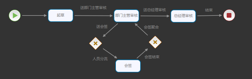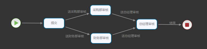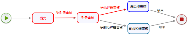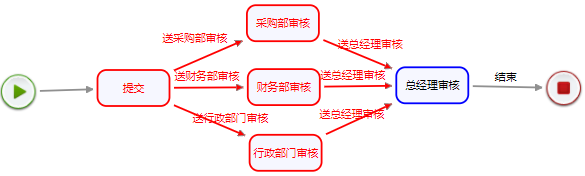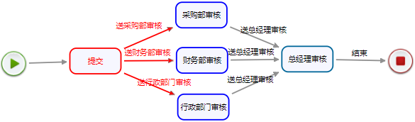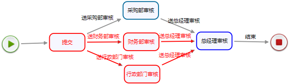 应用案例 :文件在部门主管审核结束后要送采购部、财务部的人员进行会签,在采购和财务的人员会签结束后,才能送到总经理处审核流程如图: