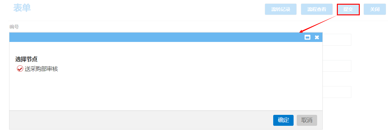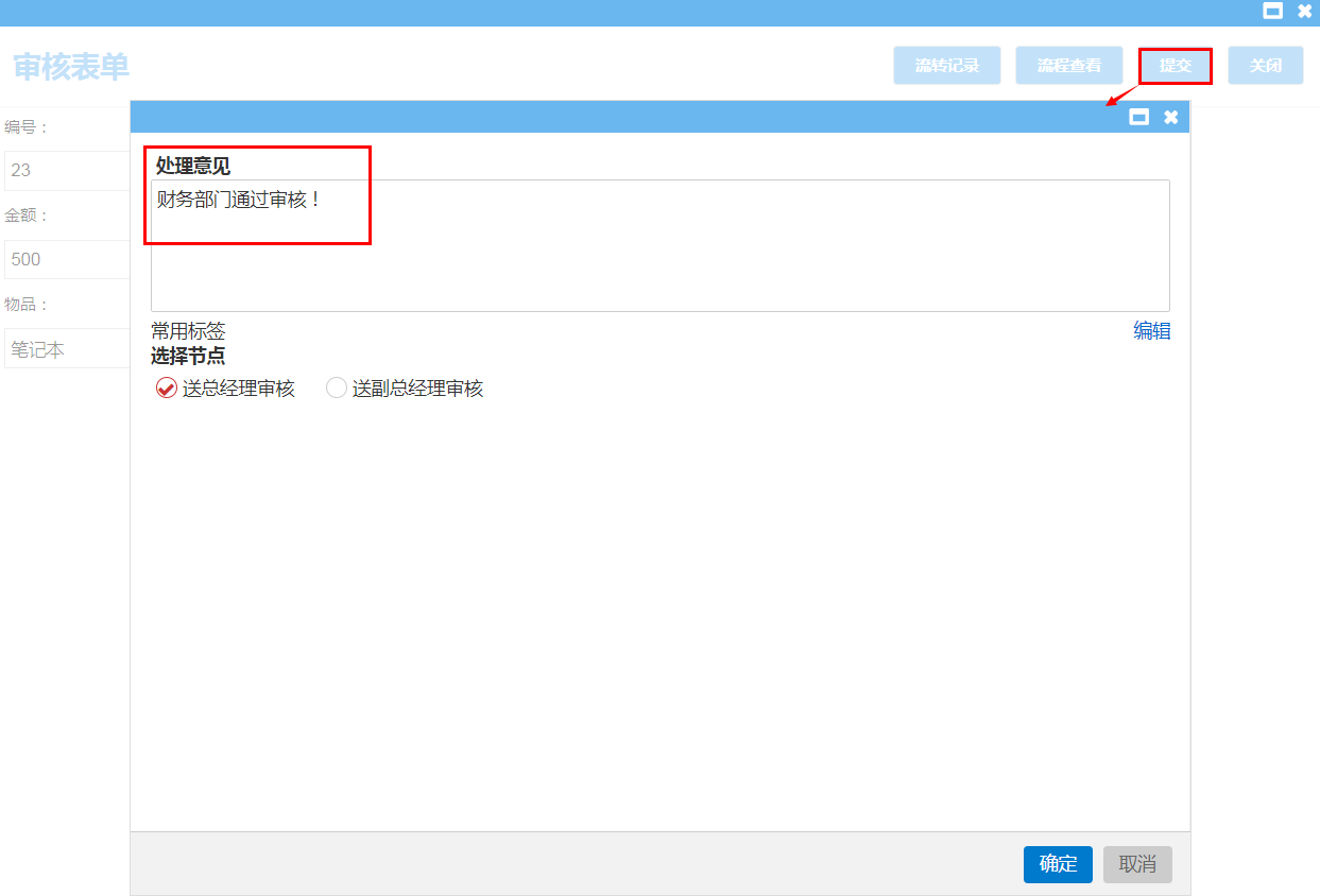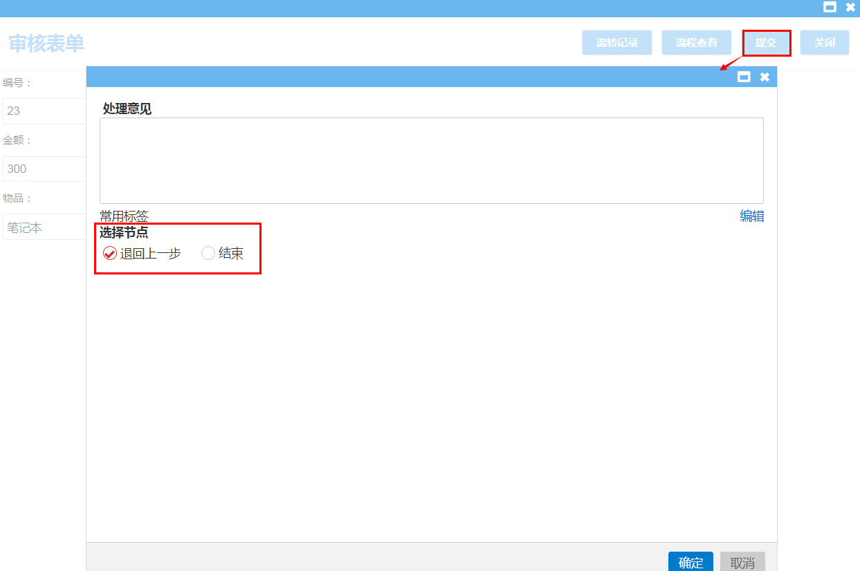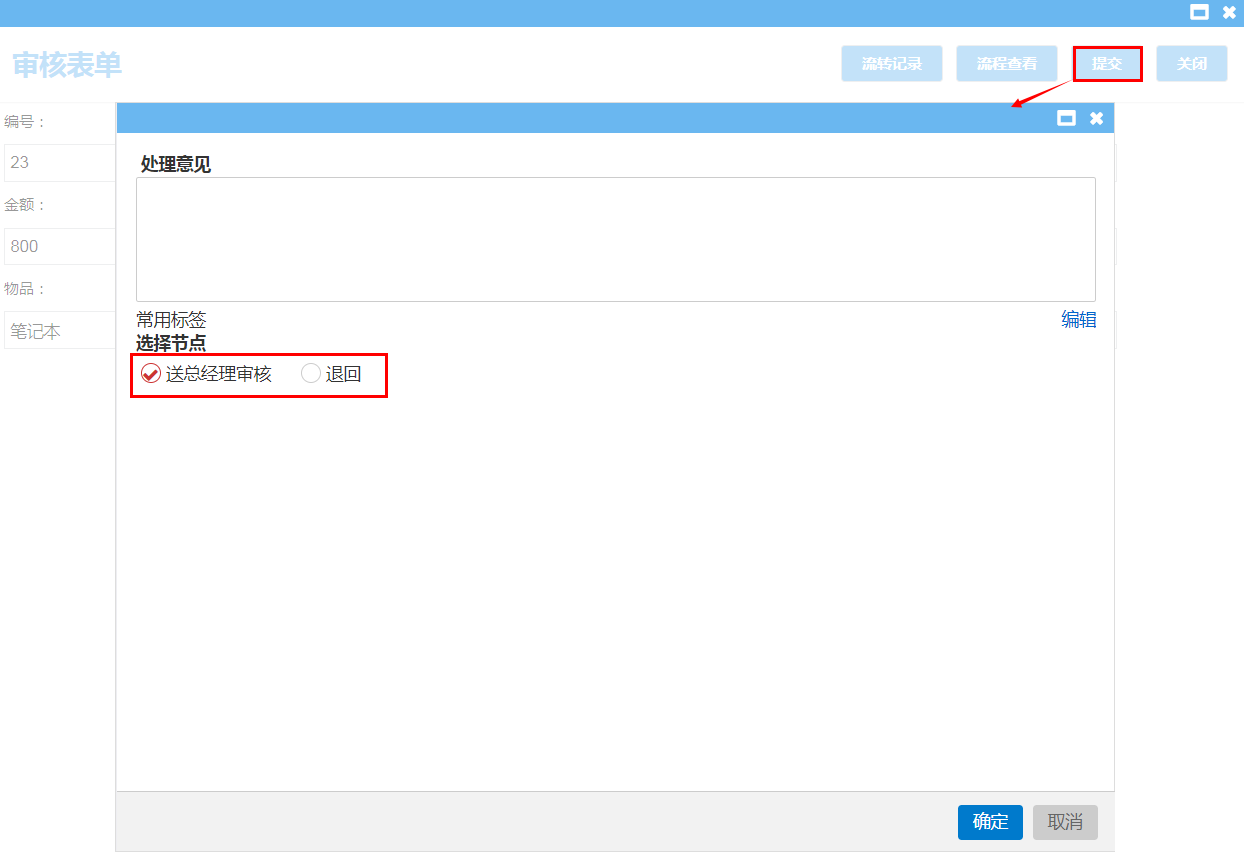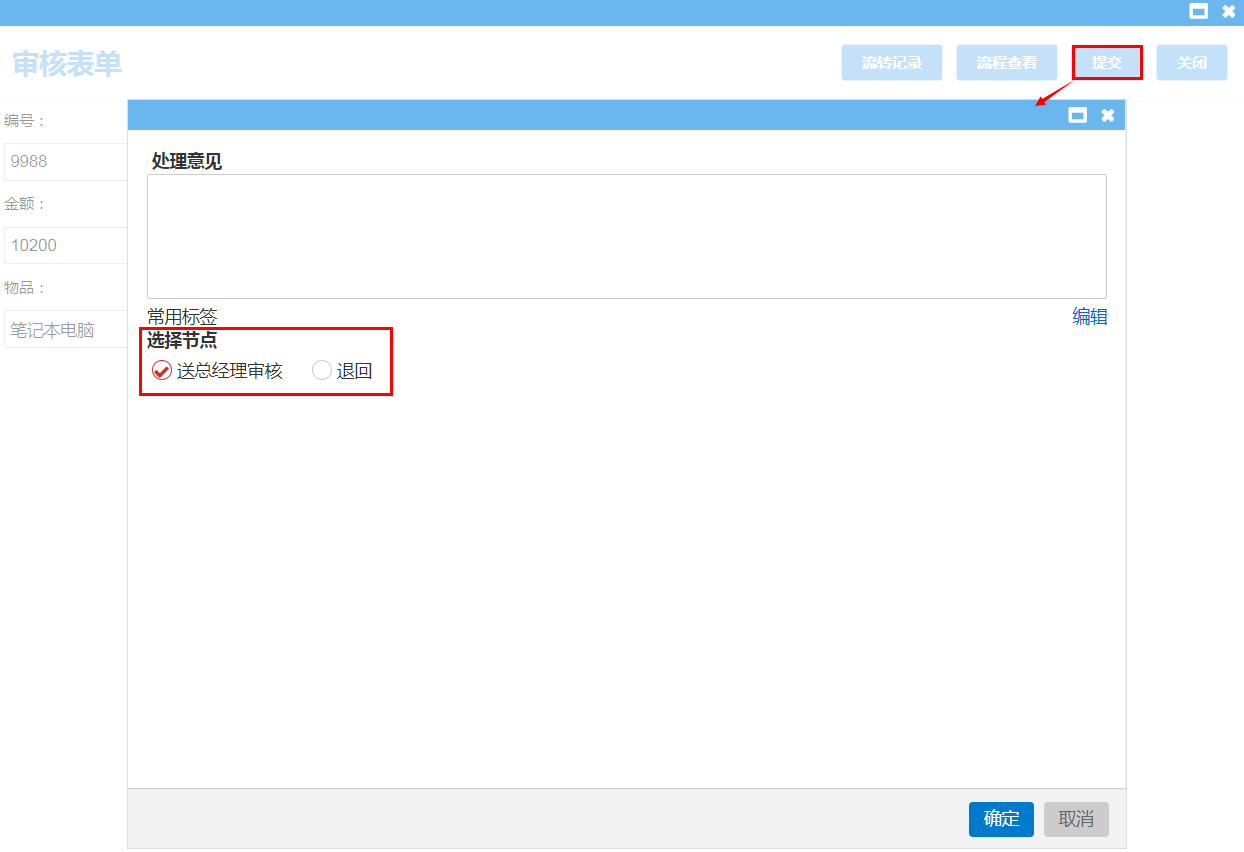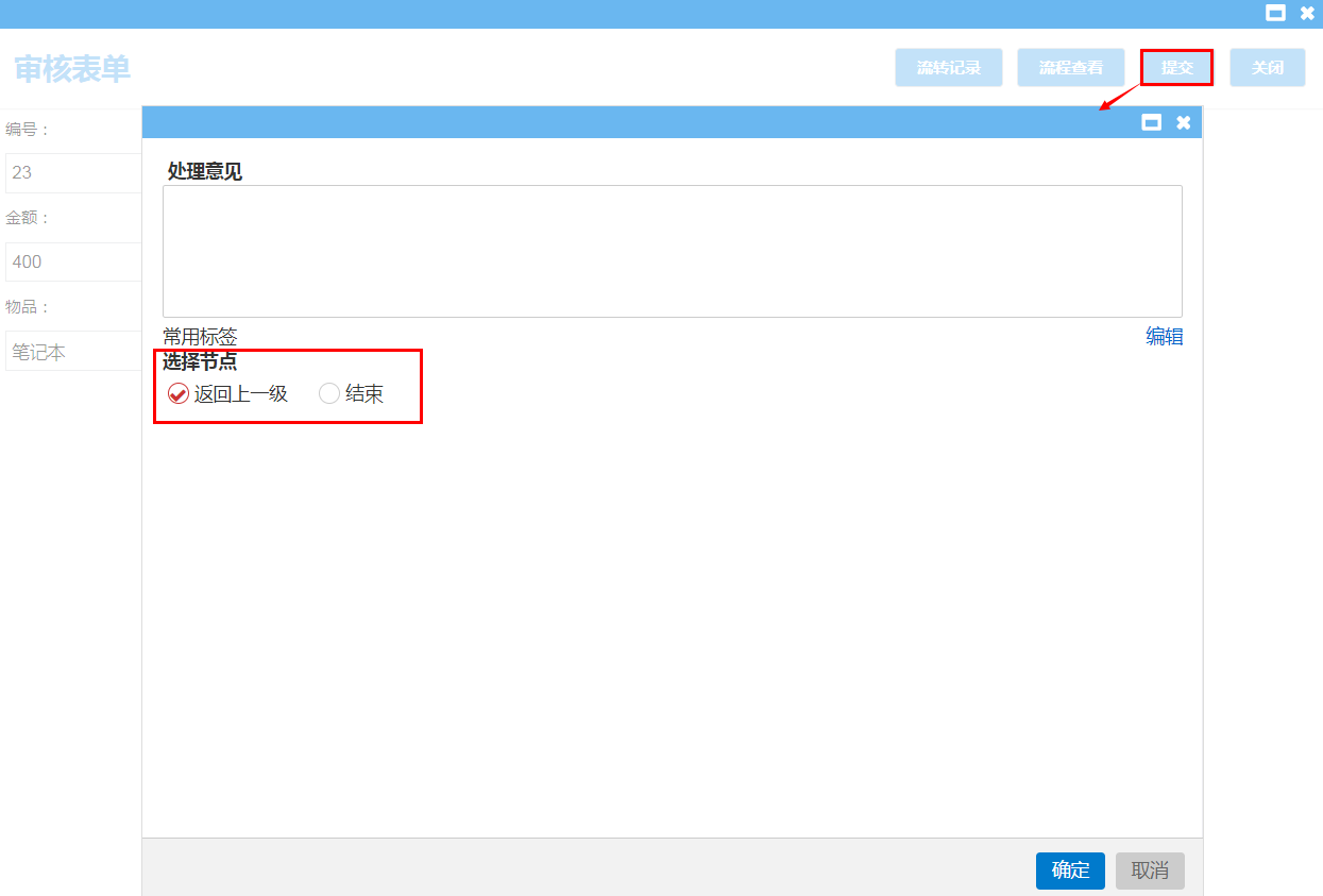 效果如下 :起草人起草窗体提交采购部审核,审核通过后发送总经理审核,总经理审核人员登录系统,点击【提交】,选择节点【返回上一级】,点击【确定】,如下图: