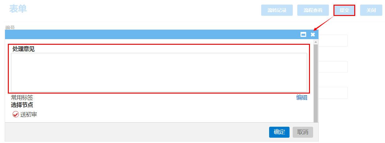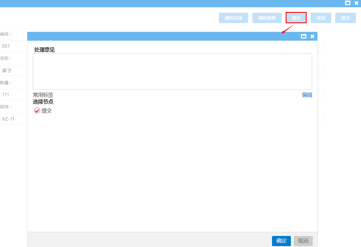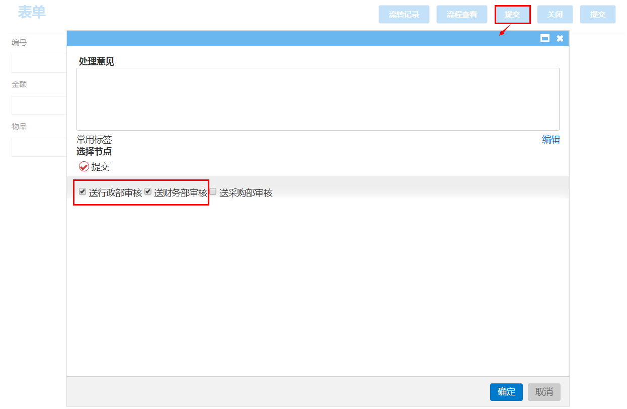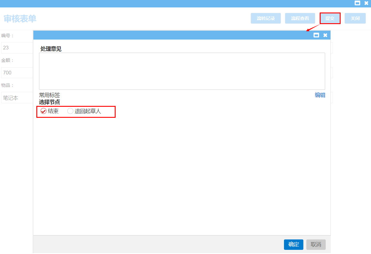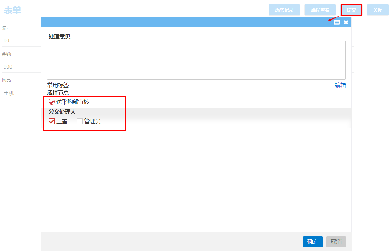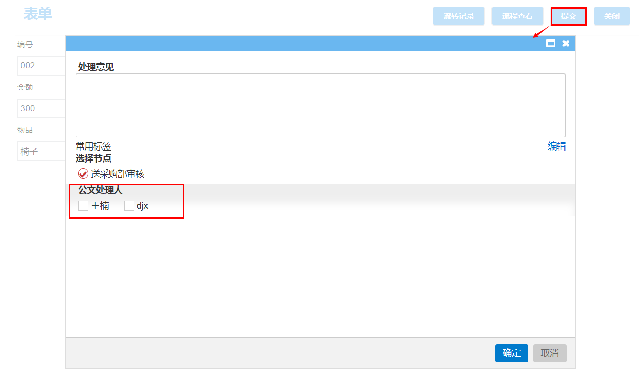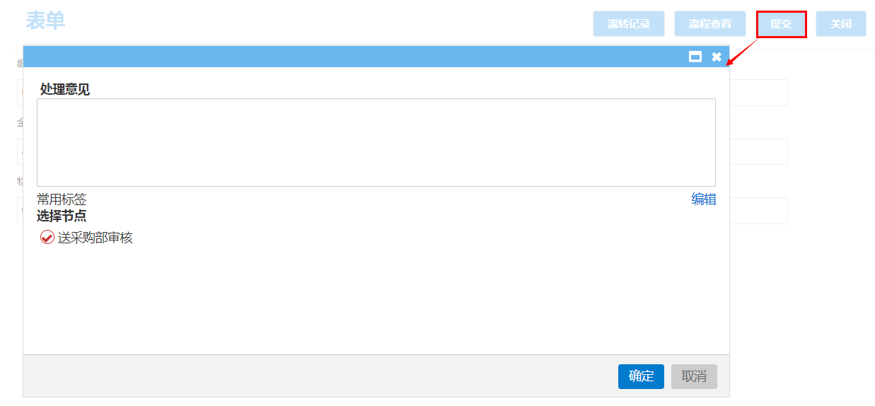 效果如下 :起草人起草窗体提交采购部审核,审核通过后发送总经理审核,总经理审核人员登录系统,点击【提交】,选择节点【返回上一级】,点击【确定】,如下图: