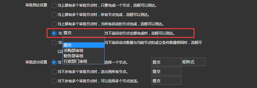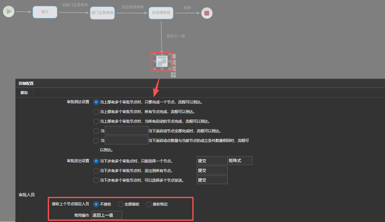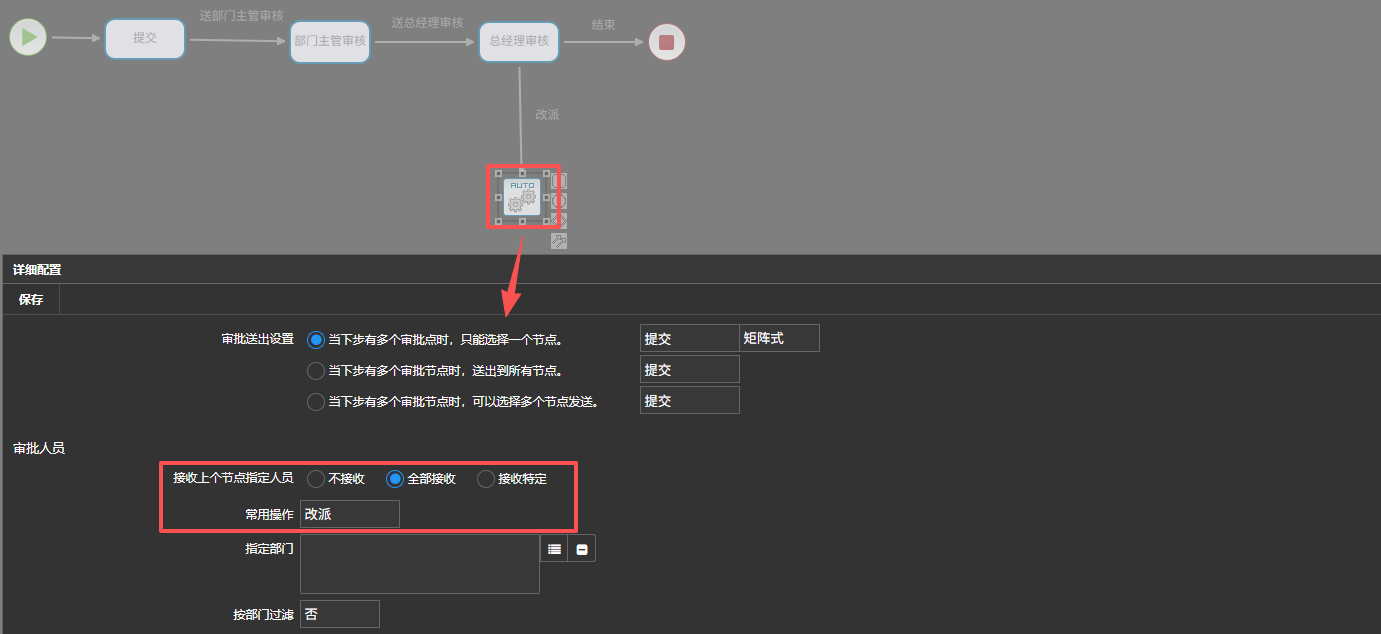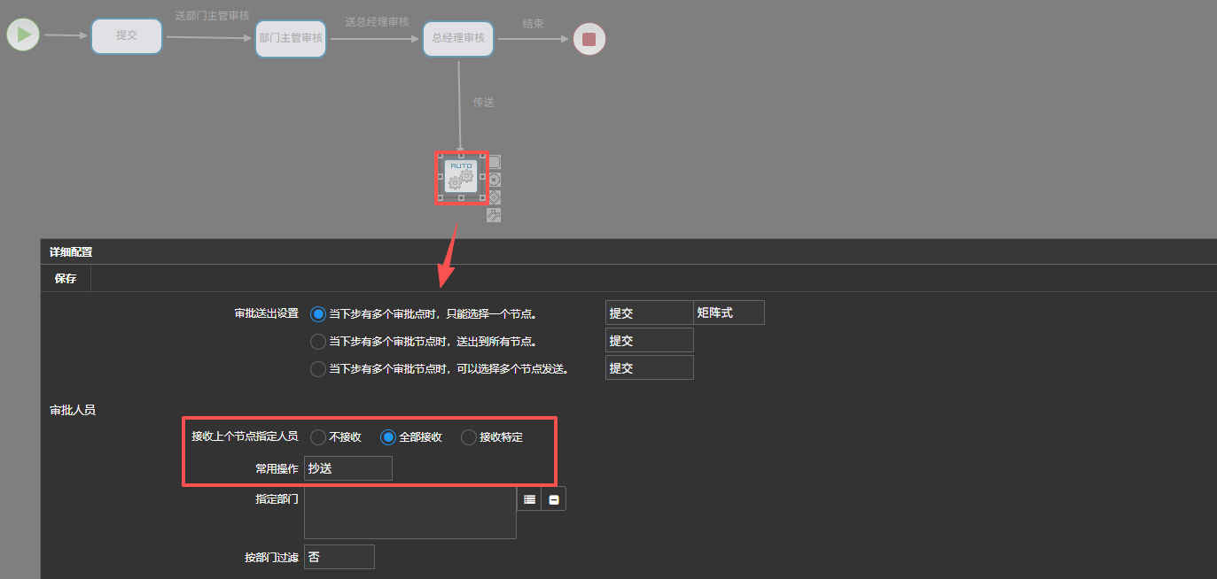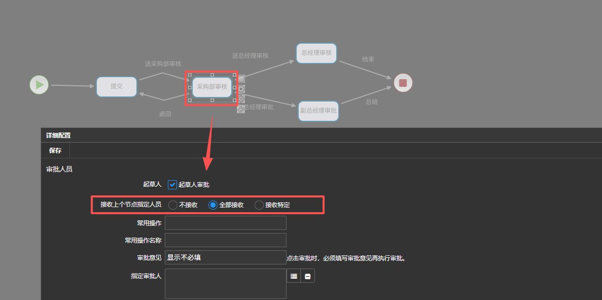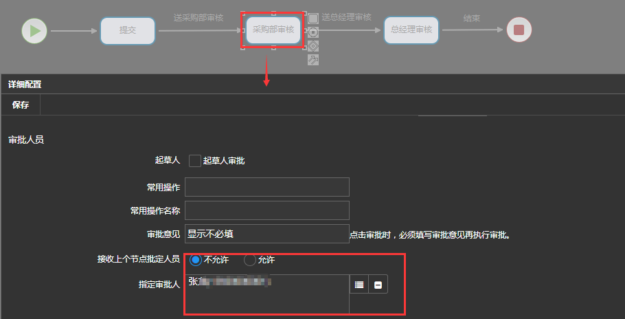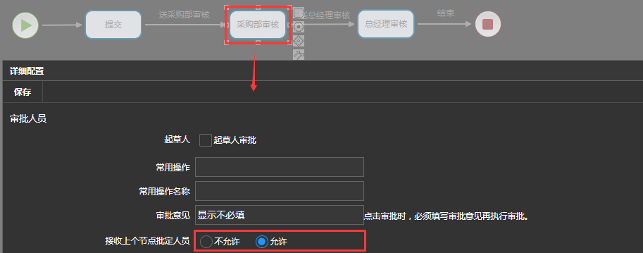 - 在“采购部审核”节点设置允许接收上个节点指定的审批人,如下图: