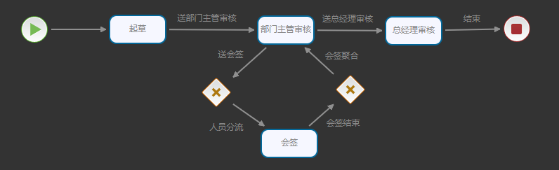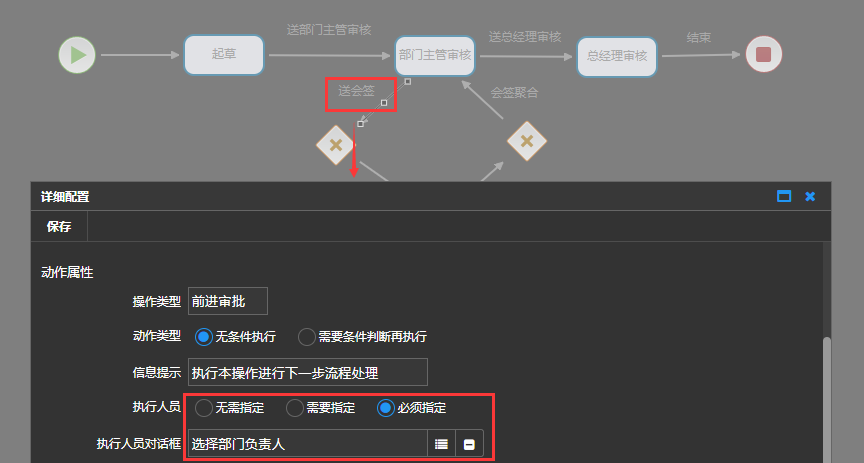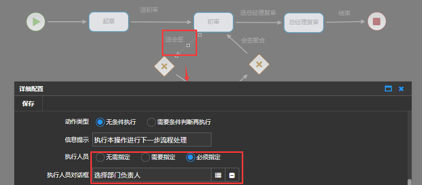 - 添加“送会签”连线,并在此处指定需要参与会签的人员,如下图: