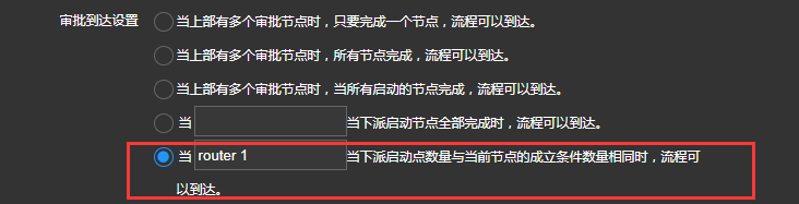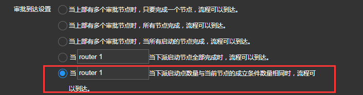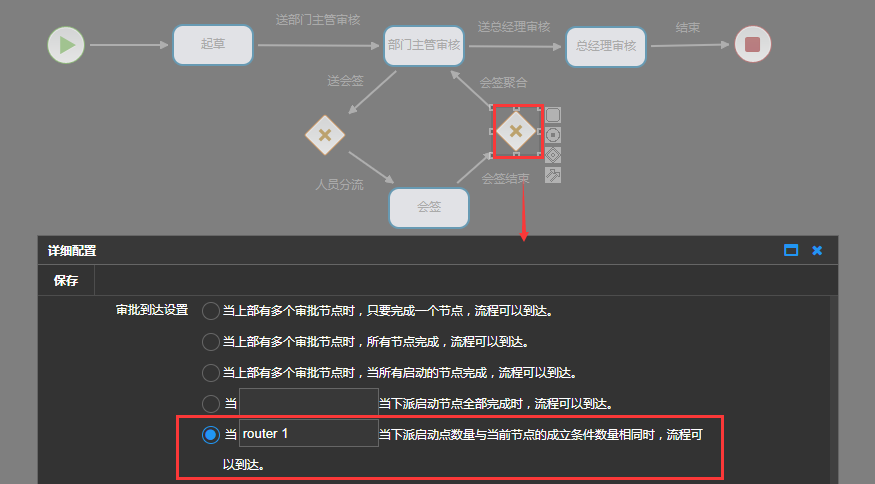 - 添加路由控件(router 2 )并且针对传到下一节点的数据进行判断,只有全部审批人员都结束审批流程才能到达,设置审批到达设置为,如下图: