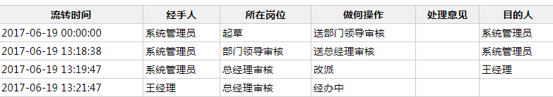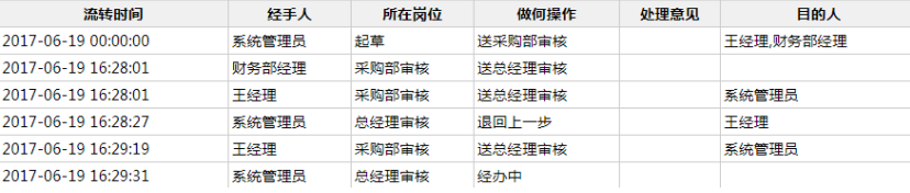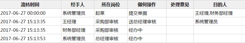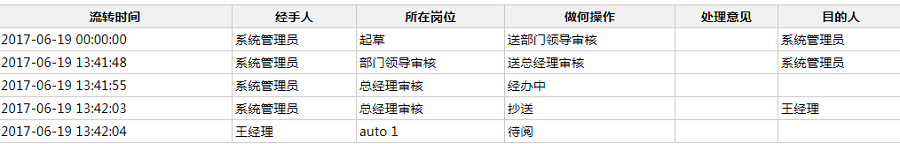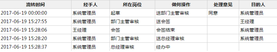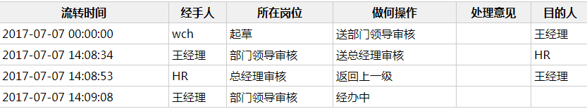 会签人员,会签结束后,“部门主管审核”节点的审核人员登录应用平台,点击窗体进行审核,在“总经理审核”节点的窗体点击【流转记录】,效果如下图: