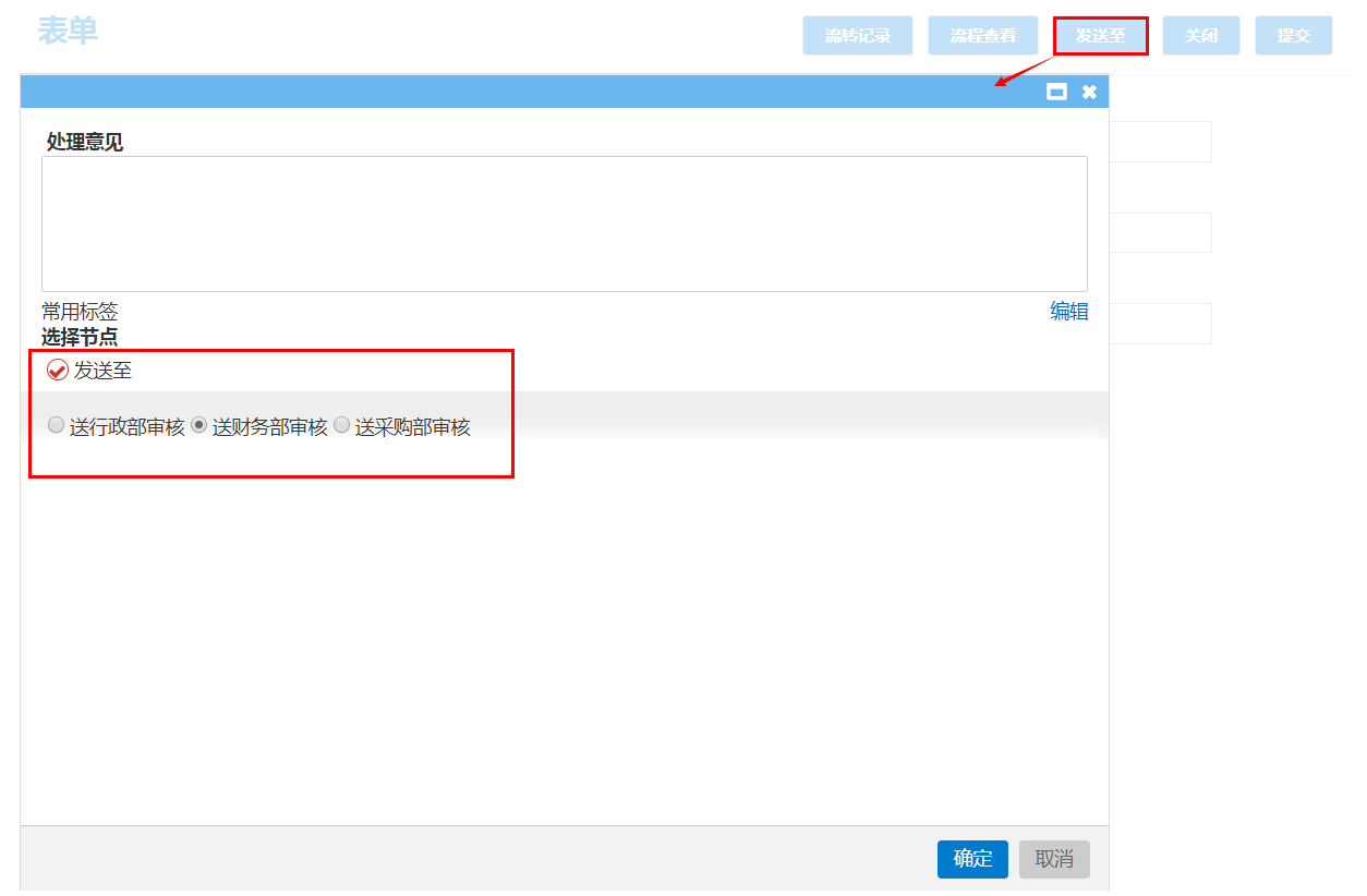 效果如下 :登录应用平台,起草窗体,点击【发送至】,弹出页面如下图: