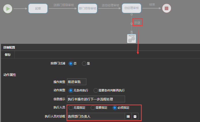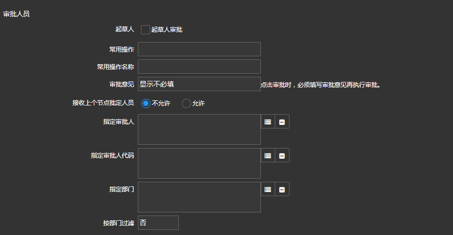 例如 :指定部门为“采购部”,指定审批人为“王经理”,当按部门过滤的时候,系统会判断起草人的上级部门,如果是采购部的,那就由王经理审批(如果起草人所在部门没有在当前节点指定,则跳过当前节点),如果指定部门为“采购部”不按部门过滤,那无论是哪个部门人员起草的窗体,在该节点都由王经理审批。