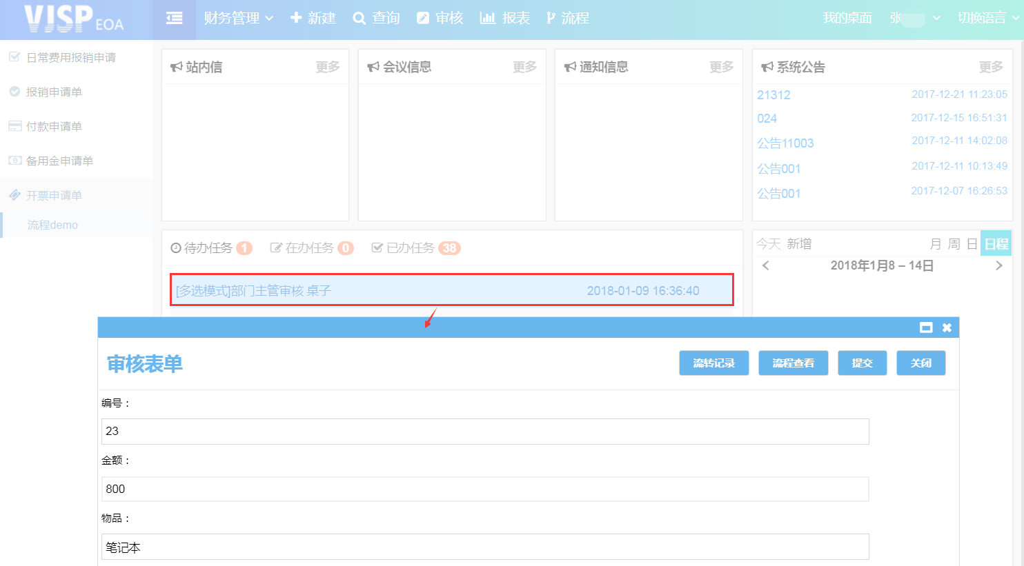 点击【确定】后,在【采购部审核】节点指定的审批人“张** ”,收到待办,点击审核窗体,如下图: