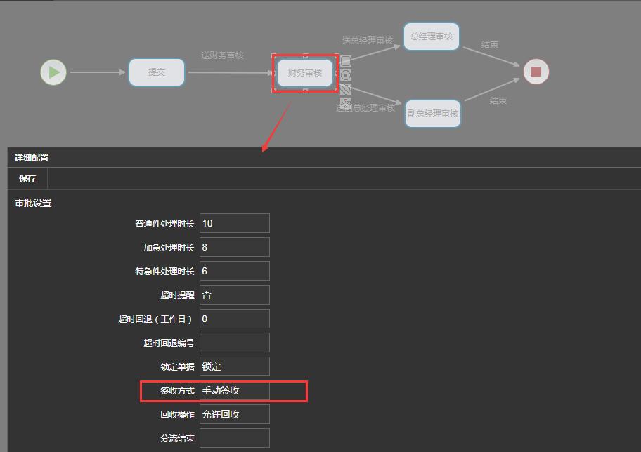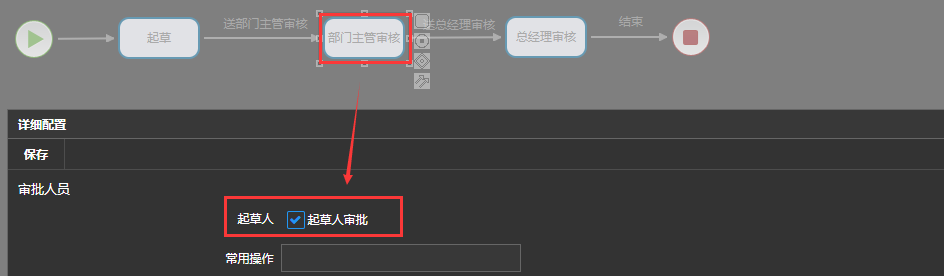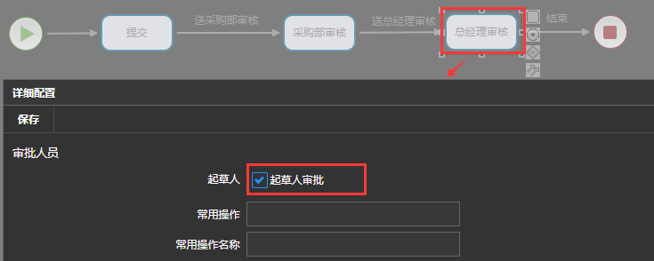 - 设置“总经理审核”节点审批人员为起草人,如下图: