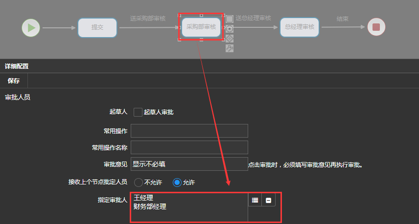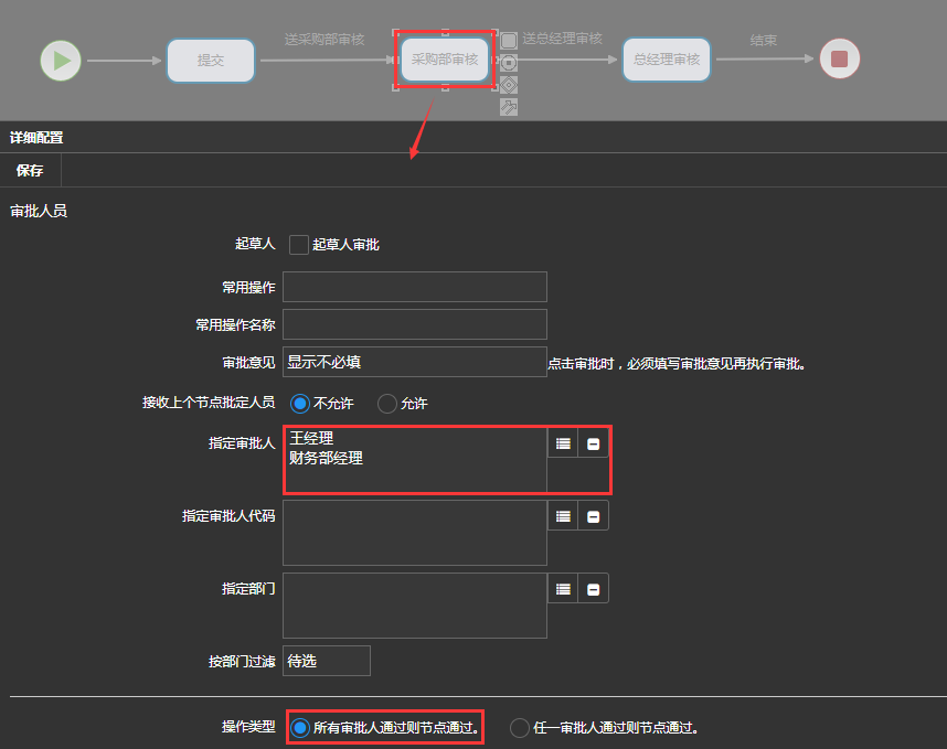 - 在“采购部审核”节点设置指定审批人为王经理和财务部经理,并且选择操作类型为【所有审批人通过,则节点通过】,如下图: