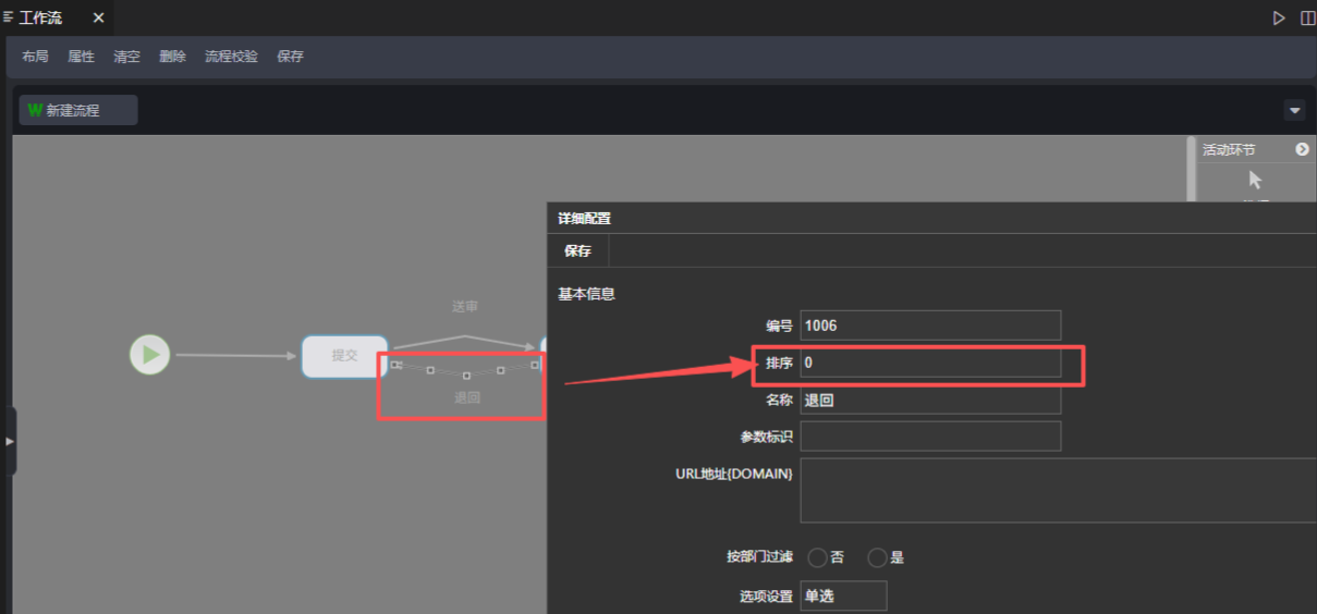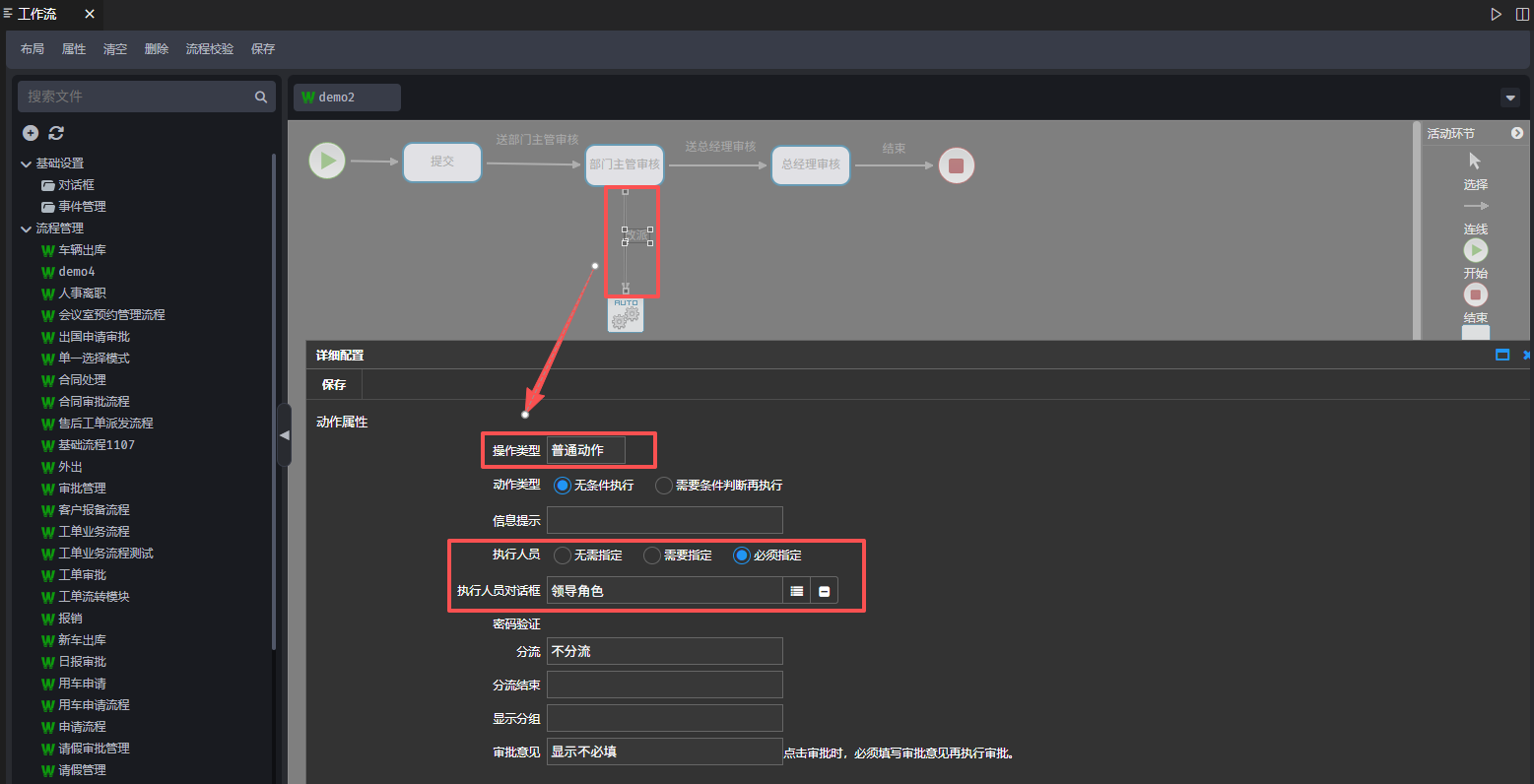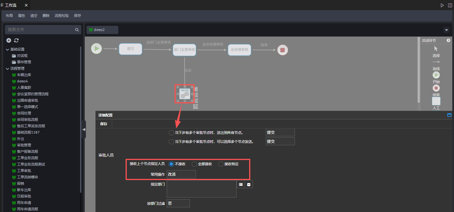 点击菜单栏【属性】或者右击控件→【详细配置】,设置其功能,自动控件主要是对其他功能的调用,可以实现抄送/改派/逻辑删除/物理删除/退回上一级/退回上一级等功能。