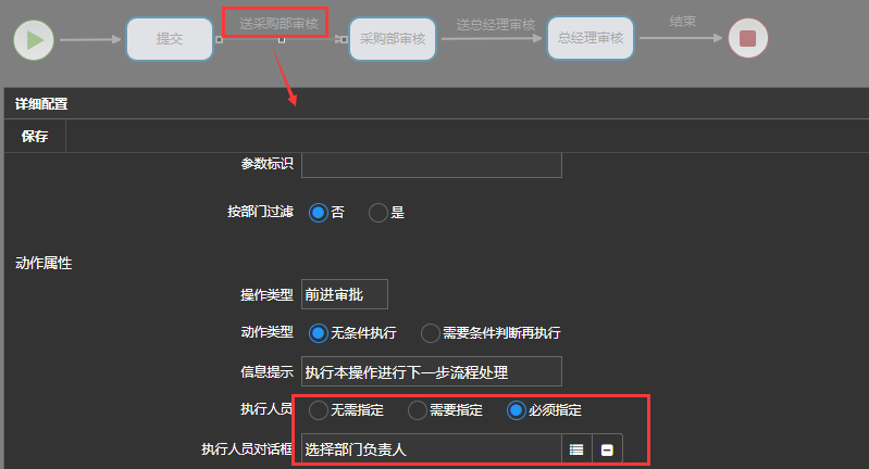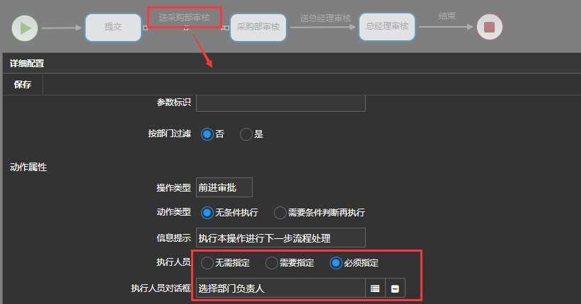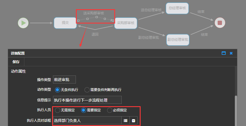 在“送采购部审核”连线中设置“送采购部审核”连线的执行人员为“需要指定”,并且指定人员选择方案,如下图: