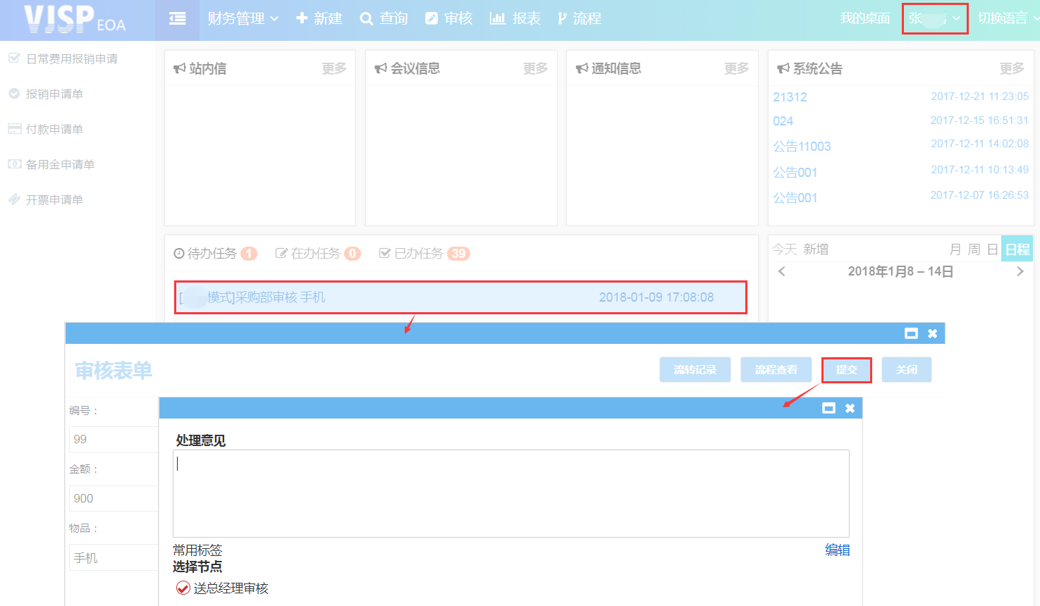 效果如下: 登录应用平台,在“总经理审核”节点,点击【提交】,选择改派人,如下图: