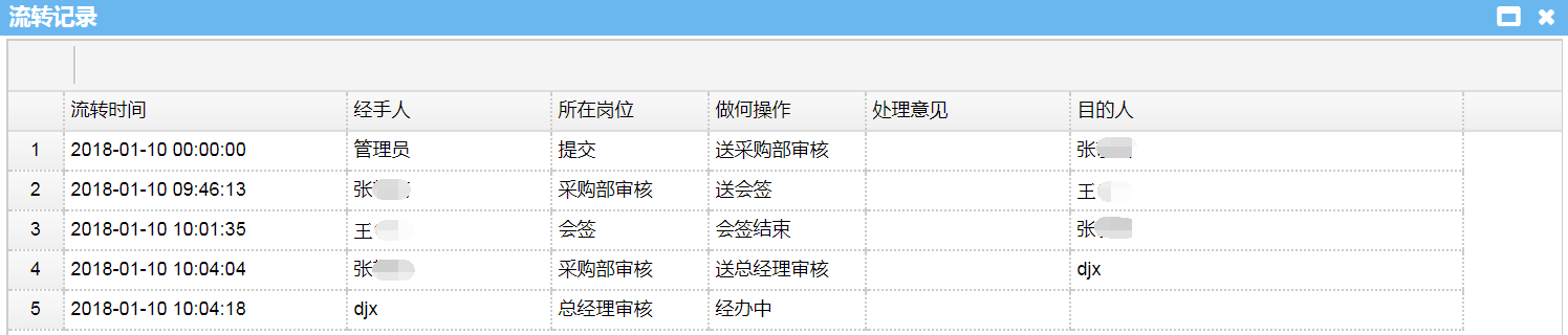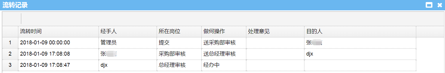 在【采购部审核】节点,审批人只能是“张** ”审核,点击窗体的流转记录,查看效果,如下图: