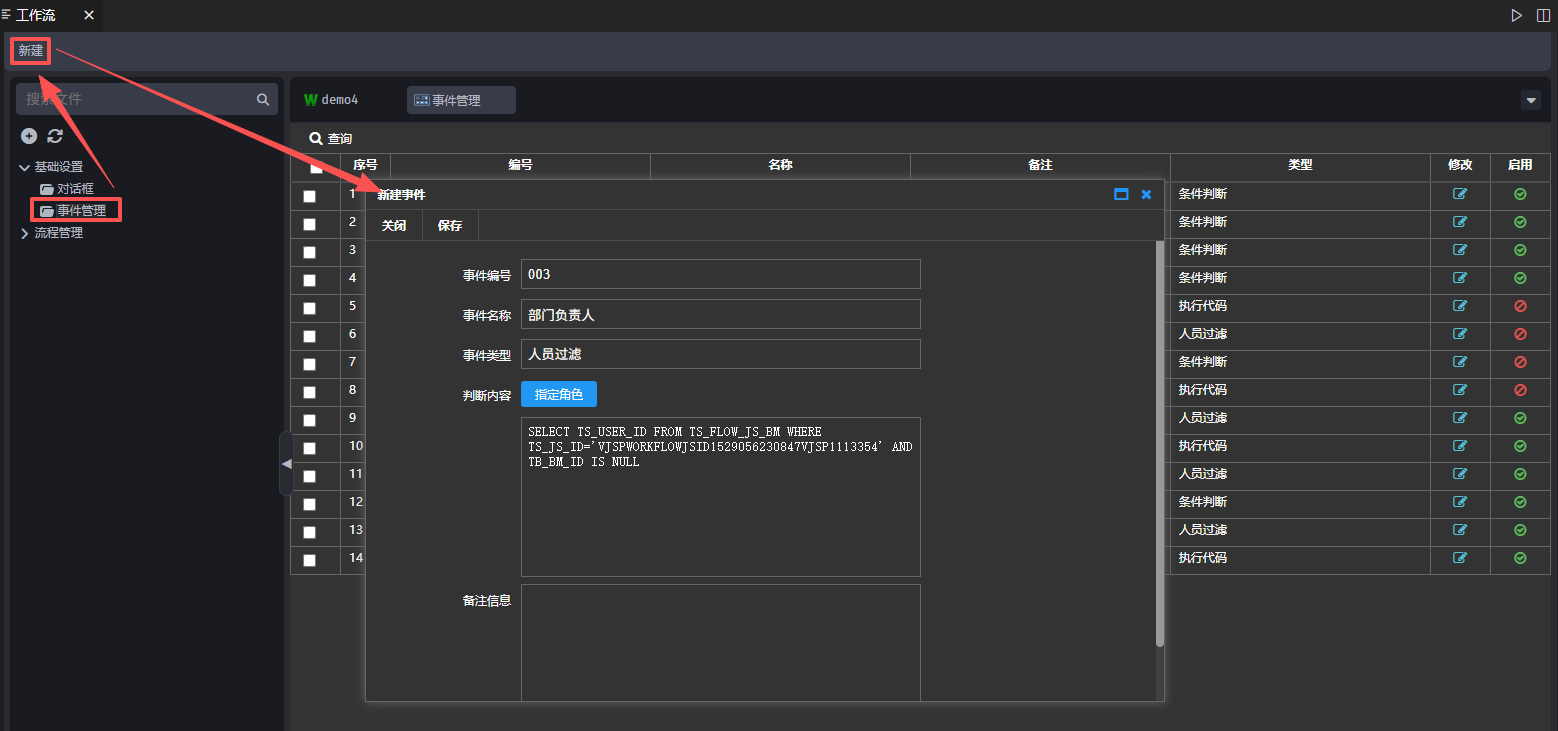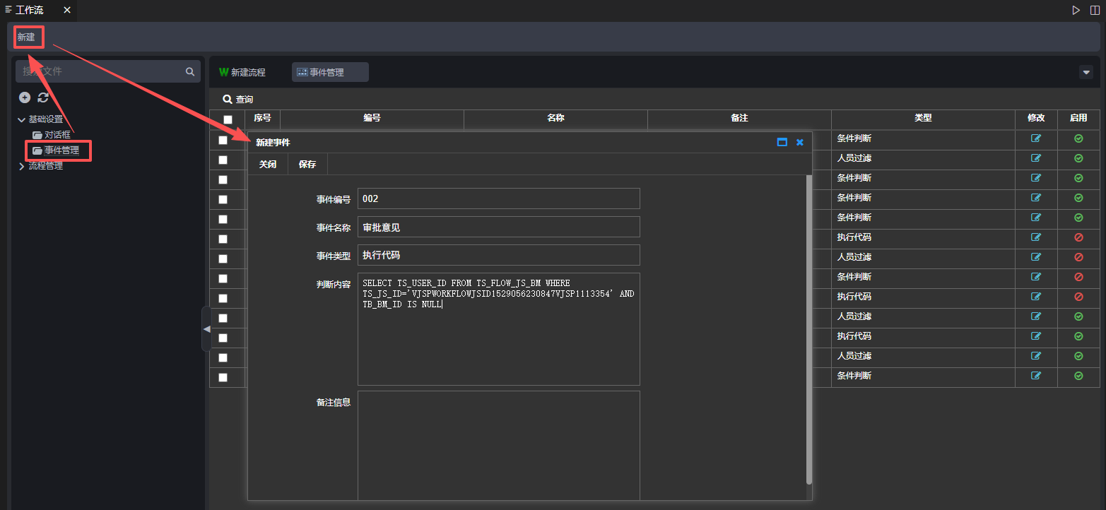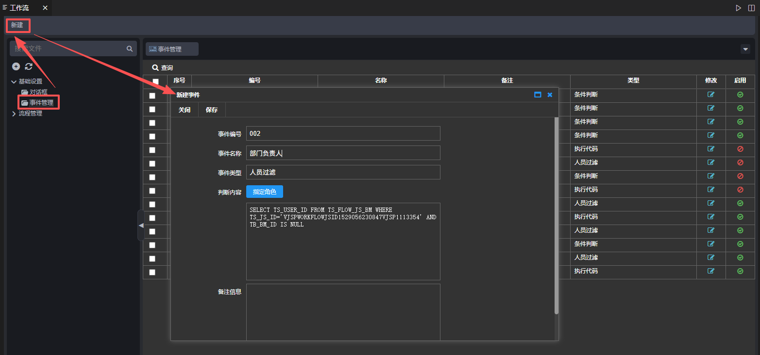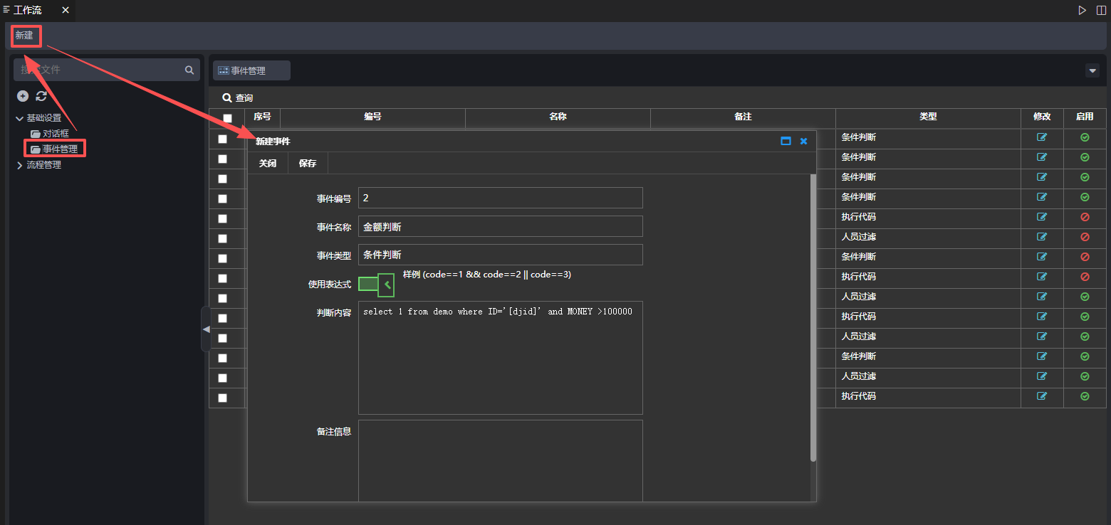 在【事件管理】中新建针对窗体金额条件判断的事件,如下图:
