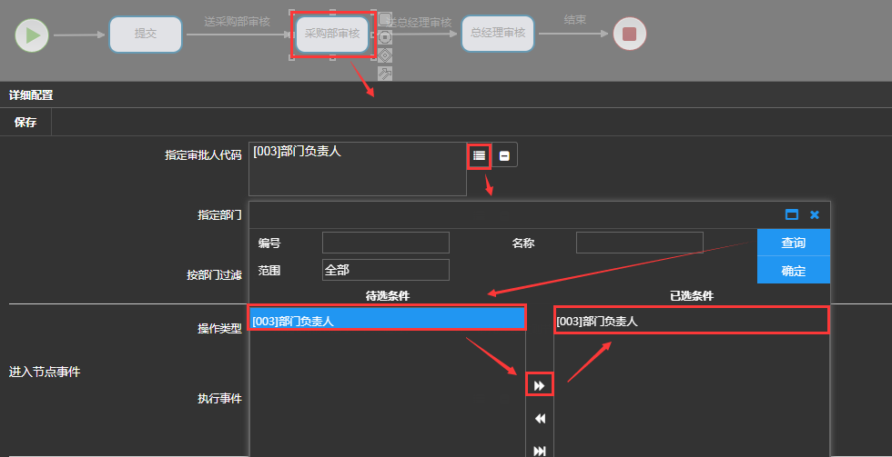 - 设置“采购部审核”节点的指定审批人代码,如下图: